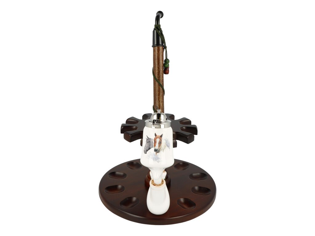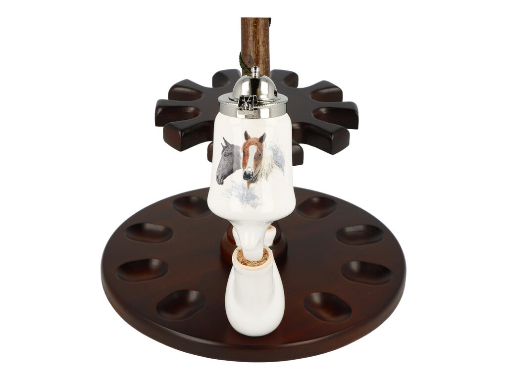 Keramická dýmka BPK Proseč. Porcelánka s koňským motivem je ručně vyrobená. Keramická část dýmky má lesklý glazurovaný povrch. Na čelní straně hlavy dýmky najdeme barevný potisk s hlavami divokých koní. Porcelánová fajfka s dřevěným troubelem ukončená akrylátovým náustkem je zdobená omotanou šňůrkou ukončenou dřevěnými korálky. Hlavu dýmky uzavírá chromové víčko, které je zdobené jemným gravírováním. Keramická dýmka je dodávaná v dárkové krabičce. Zobrazený stojánek není součástí balení dýmky.