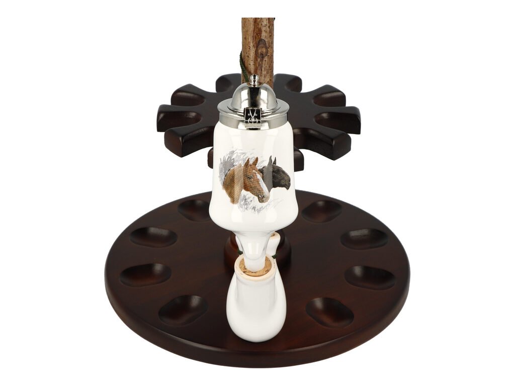 Keramická dýmka BPK Proseč. Porcelánka s koňským motivem je ručně vyrobená. Keramická část dýmky má lesklý glazurovaný povrch. Na čelní straně hlavy dýmky najdeme barevný potisk s divokými koňmi. Porcelánová fajfka s dřevěným troubelem ukončená akrylátovým náustkem je zdobená omotanou šňůrkou ukončenou dřevěnými korálky. Hlavu dýmky uzavírá chromové víčko, které je zdobené jemným gravírováním. Keramická dýmka je dodávaná v dárkové krabičce. Zobrazený stojánek není součástí balení dýmky.