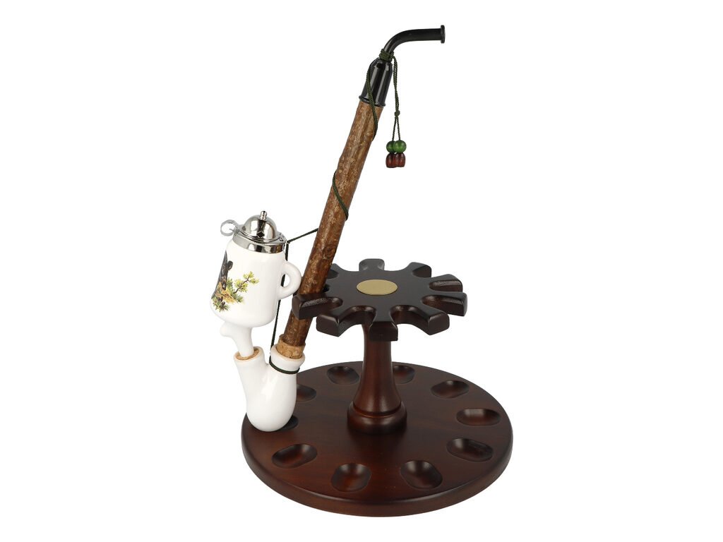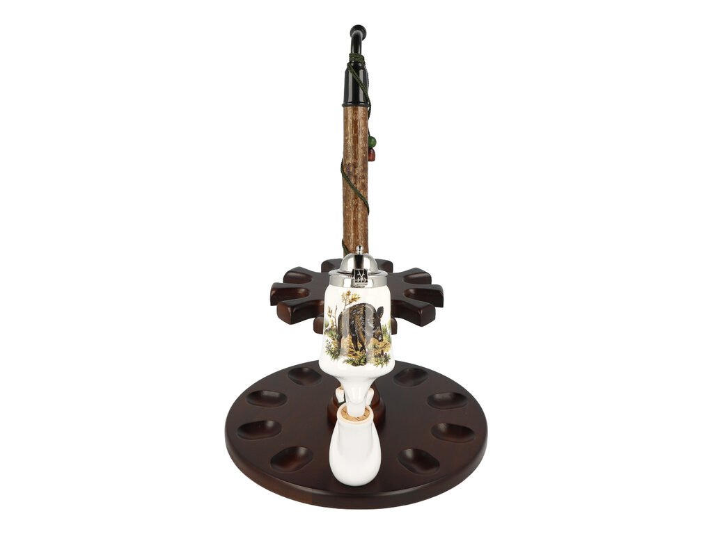 Keramická dýmka BPK Proseč. Porcelánka s loveckým motivem je ručně vyrobená. Keramická část dýmky má lesklý glazurovaný povrch. Na čelní straně hlavy dýmky najdeme barevný potisk s divočákem. Porcelánová fajfka s dřevěným troubelem ukončená akrylátovým náustkem je zdobená omotanou šňůrkou ukončenou dřevěnými korálky. Hlavu dýmky uzavírá chromové víčko, které je zdobené jemným gravírováním. Keramická dýmka je dodávaná v dárkové krabičce. Zobrazený stojánek není součástí balení dýmky.