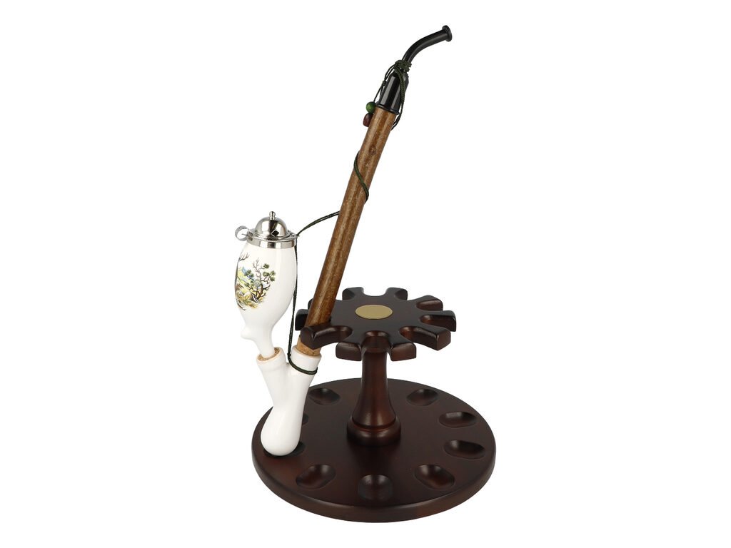 Keramická dýmka BPK Proseč. Porcelánka s loveckým motivem je ručně vyrobená. Keramická část dýmky má lesklý glazurovaný povrch. Na čelní straně hlavy dýmky najdeme barevný potisk s jelenem. Porcelánová fajfka s dřevěným troubelem ukončená akrylátovým náustkem je zdobená omotanou šňůrkou ukončenou dřevěnými korálky. Hlavu dýmky uzavírá chromové víčko, které je zdobené jemným gravírováním. Keramická dýmka je dodávaná v dárkové krabičce. Zobrazený stojánek není součástí balení dýmky.