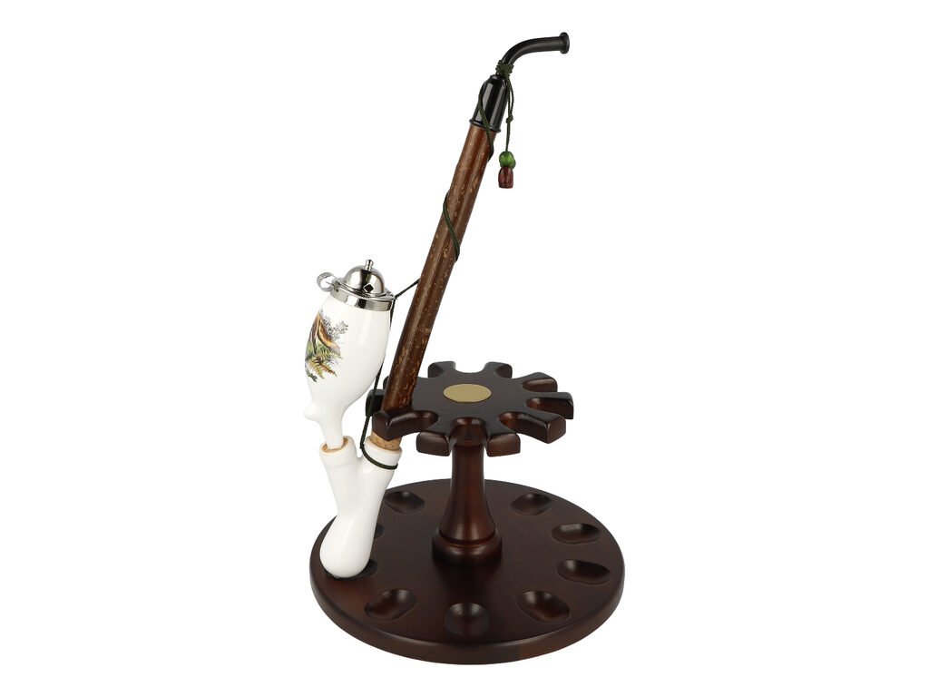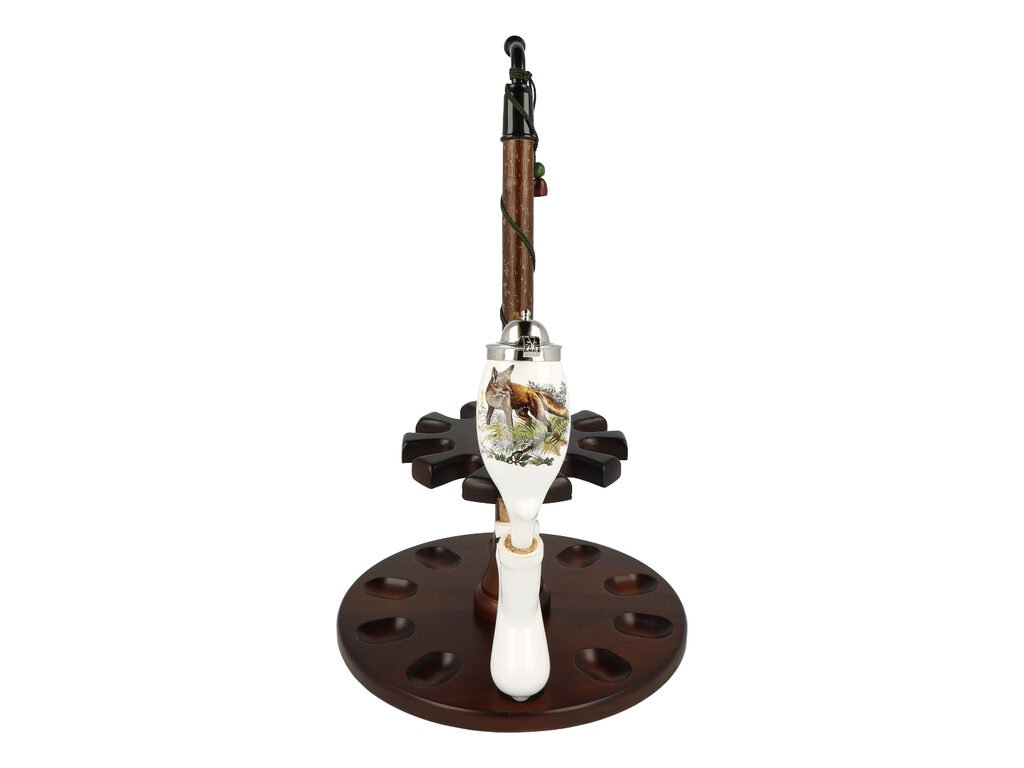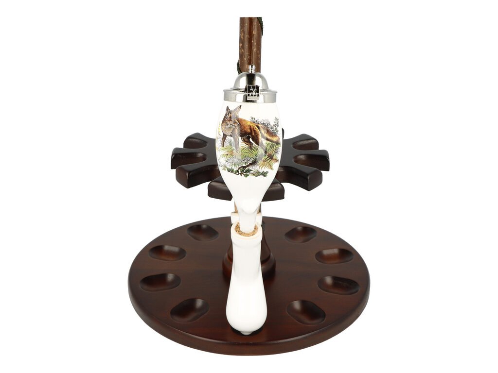 Keramická dýmka BPK Proseč. Porcelánka s loveckým motivem je ručně vyrobená. Keramická část dýmky má lesklý glazurovaný povrch. Na čelní straně hlavy dýmky najdeme barevný potisk s liškou. Porcelánová fajfka s dřevěným troubelem ukončená akrylátovým náustkem je zdobená omotanou šňůrkou ukončenou dřevěnými korálky. Hlavu dýmky uzavírá chromové víčko, které je zdobené jemným gravírováním. Keramická dýmka je dodávaná v dárkové krabičce. Zobrazený stojánek není součástí balení dýmky.
