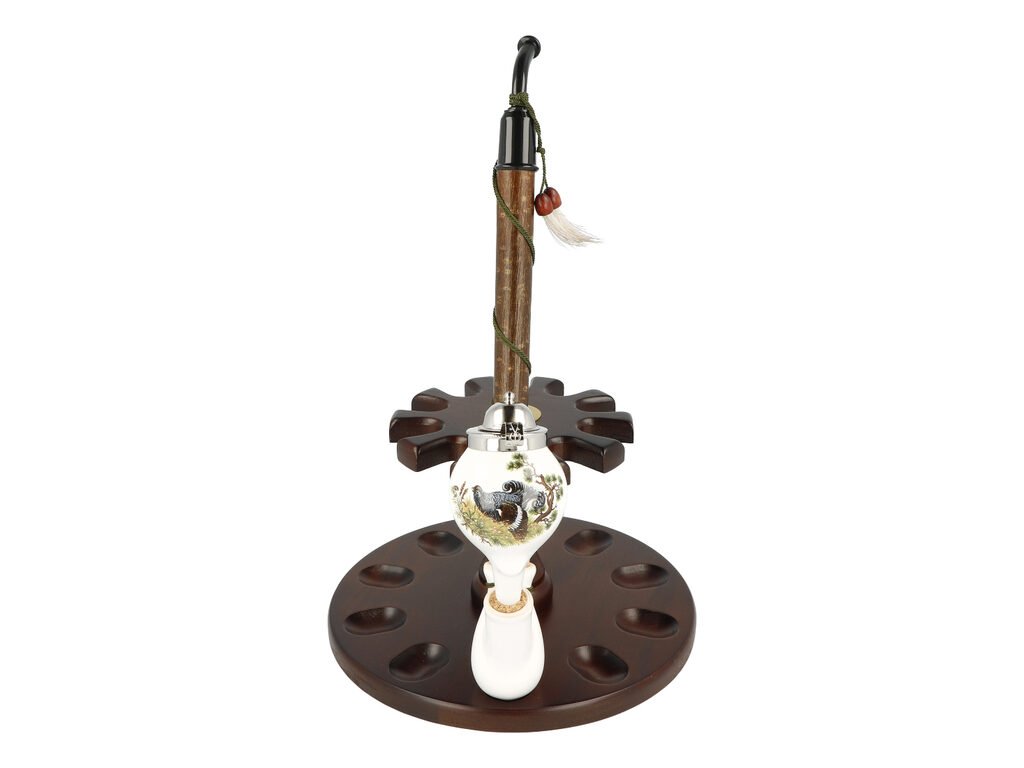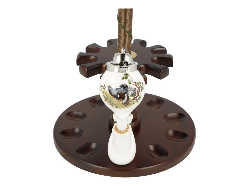 Keramická dýmka BPK Proseč. Porcelánka s loveckým motivem je ručně vyrobená. Keramická část dýmky má lesklý glazurovaný povrch. Na čelní straně hlavy dýmky najdeme barevný potisk s tetřevem. Porcelánová fajfka s dřevěným troubelem ukončená akrylátovým náustkem je zdobená omotanou šňůrkou ukončenou dřevěnými korálky. Hlavu dýmky uzavírá chromové víčko, které je zdobené jemným gravírováním. Keramická dýmka je dodávaná v dárkové krabičce. Zobrazený stojánek není součástí balení dýmky.