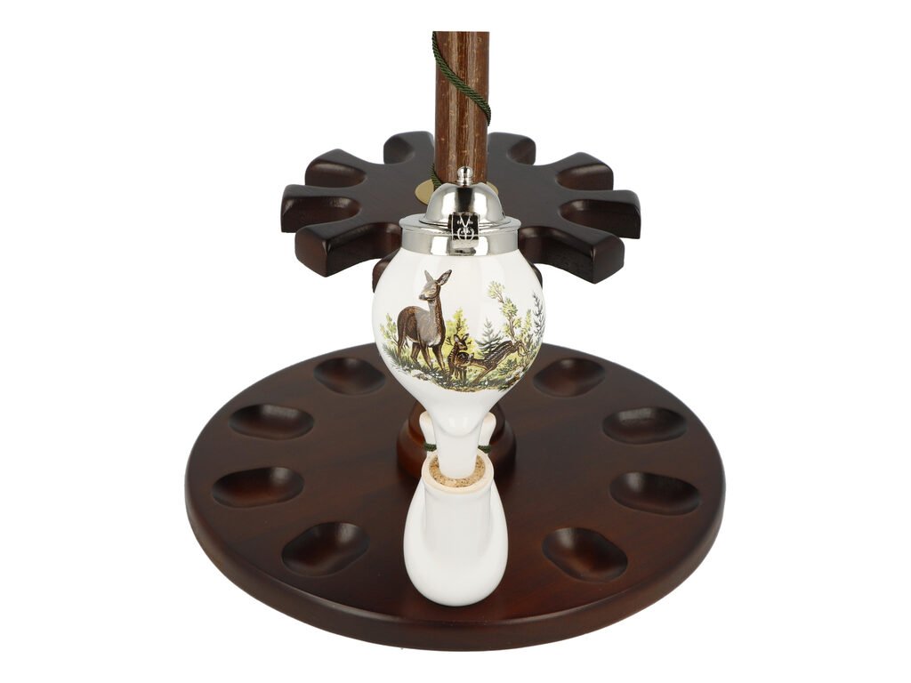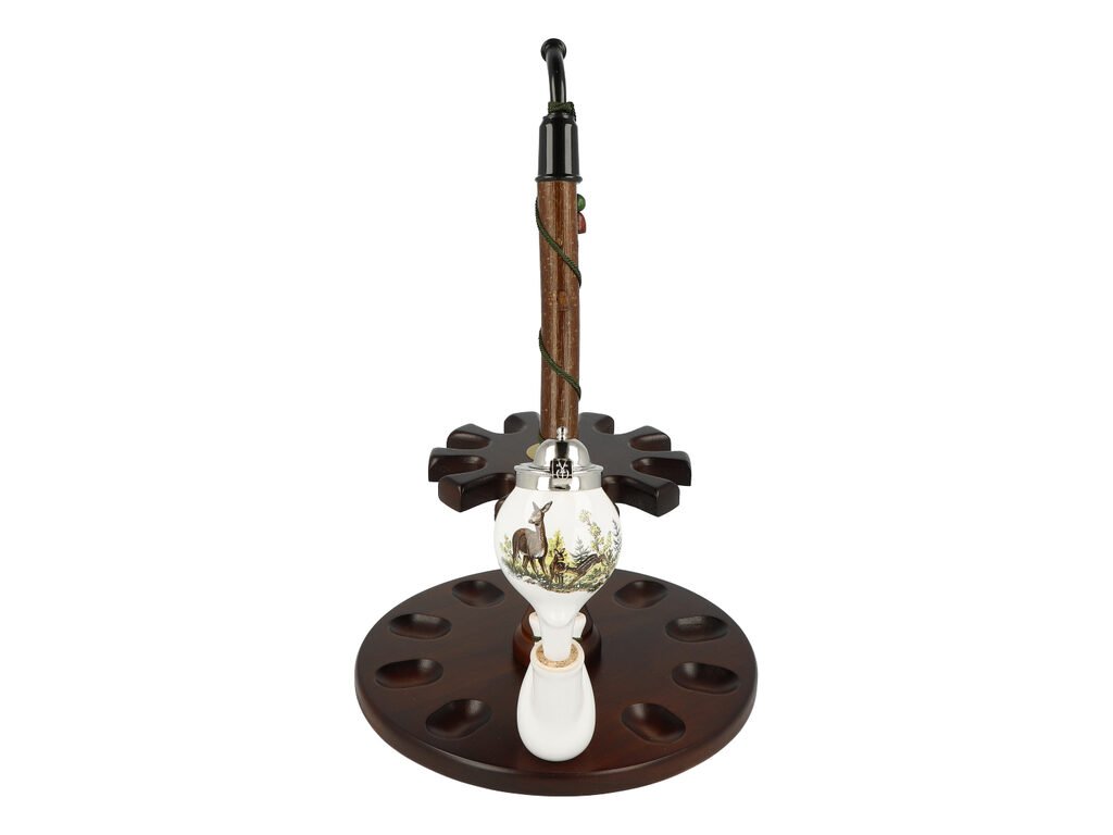 Keramická dýmka BPK Proseč. Porcelánka s loveckým motivem je ručně vyrobená. Keramická část dýmky má lesklý glazurovaný povrch. Na čelní straně hlavy dýmky najdeme barevný potisk se srnkou a mláďaty. Porcelánová fajfka s dřevěným troubelem ukončená akrylátovým náustkem je zdobená omotanou šňůrkou ukončenou dřevěnými korálky. Hlavu dýmky uzavírá chromové víčko, které je zdobené jemným gravírováním. Keramická dýmka je dodávaná v dárkové krabičce. Zobrazený stojánek není součástí balení dýmky.