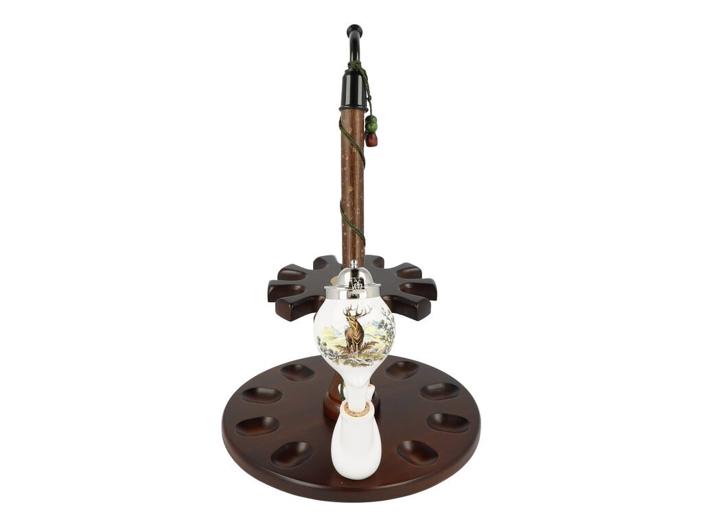 Keramická dýmka BPK Proseč. Porcelánka s loveckým motivem je ručně vyrobená. Keramická část dýmky má lesklý glazurovaný povrch. Na čelní straně hlavy dýmky najdeme barevný potisk s jelenem. Porcelánová fajfka s dřevěným troubelem ukončená akrylátovým náustkem je zdobená omotanou šňůrkou ukončenou dřevěnými korálky. Hlavu dýmky uzavírá chromové víčko, které je zdobené jemným gravírováním. Keramická dýmka je dodávaná v dárkové krabičce. Zobrazený stojánek není součástí balení dýmky.