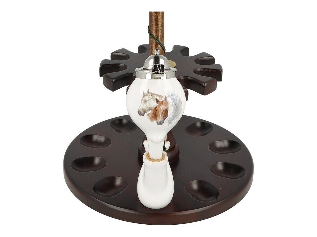 Keramická dýmka BPK Proseč. Porcelánka s koňským motivem je ručně vyrobená. Keramická část dýmky má lesklý glazurovaný povrch. Na čelní straně hlavy dýmky najdeme barevný potisk s koňmi. Porcelánová fajfka s dřevěným troubelem ukončená akrylátovým náustkem je zdobená omotanou šňůrkou ukončenou dřevěnými korálky. Hlavu dýmky uzavírá chromové víčko, které je zdobené jemným gravírováním. Keramická dýmka je dodávaná v dárkové krabičce. Zobrazený stojánek není součástí balení dýmky.