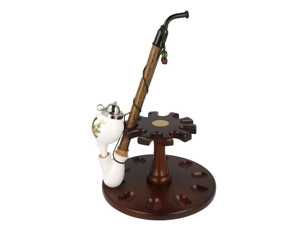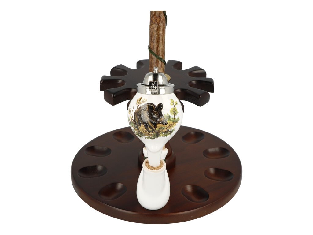 Keramická dýmka BPK Proseč. Porcelánka s loveckým motivem je ručně vyrobená. Keramická část dýmky má lesklý glazurovaný povrch. Na čelní straně hlavy dýmky najdeme barevný potisk s divočákem. Porcelánová fajfka s dřevěným troubelem ukončená akrylátovým náustkem je zdobená omotanou šňůrkou ukončenou dřevěnými korálky. Hlavu dýmky uzavírá chromové víčko, které je zdobené jemným gravírováním. Keramická dýmka je dodávaná v dárkové krabičce. Zobrazený stojánek není součástí balení dýmky.