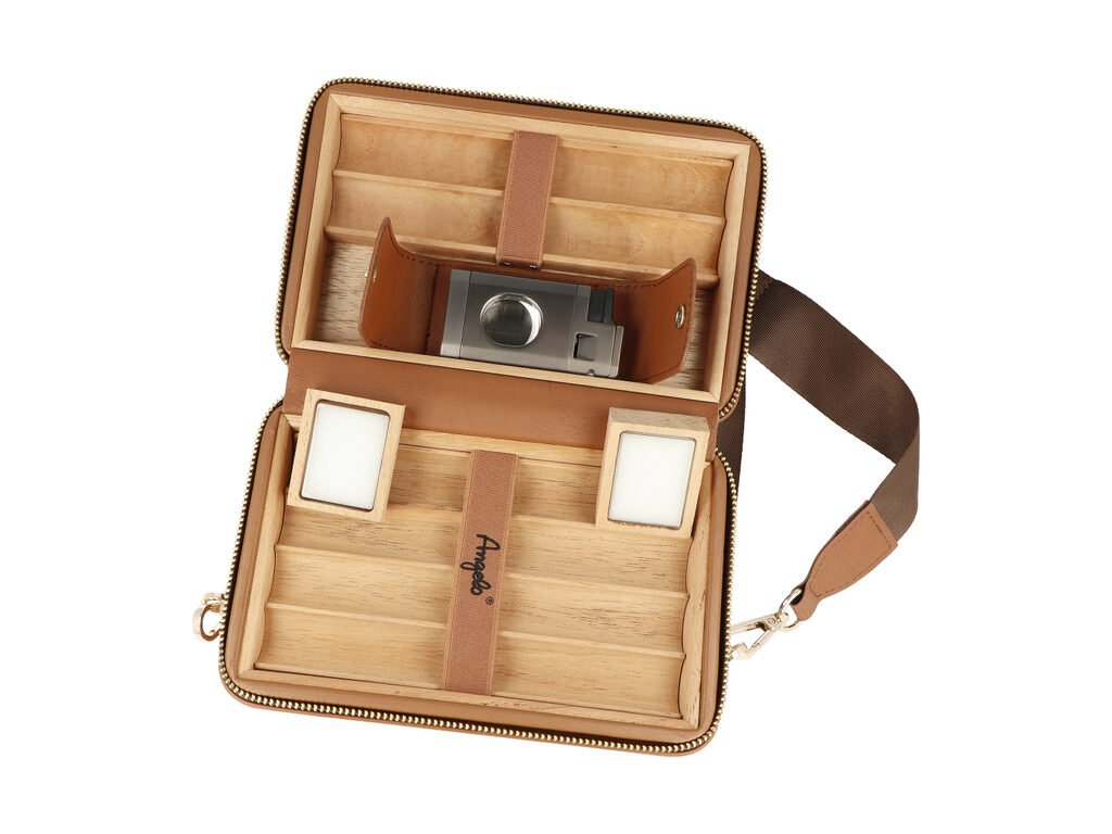 Cestovní humidor na doutníky Angelo Leather na 6 doutníků. Kožený humidor se zipem, popruhem a zapalovačem je ve hnědém matném provedení. Vnitřní prostor cestovního humidoru je vyložený cedrovým dřevem, které prospívá skladování doutníků. Uvnitř najdeme dvě cedrové vložky pro doutníky, ve kterých jsou pevně uchycené pomocí gumy. Humidor je vybavený dvěma zvlhčovači s molitanovou výplní. Vlhkoměr není součástí dodávky. Dále v balení najdeme praktický doutníkový zapalovač se třemi tryskami a integrovaným ořezávačem doutníků. Humidor je uzavřen kvalitním zipem a k popruhu je upevněn pomocí kovových karabin. Humidor, který Vám na cestách Vaše doutníky ochrání a správně uchová je dodávaný v kartonové krabici.