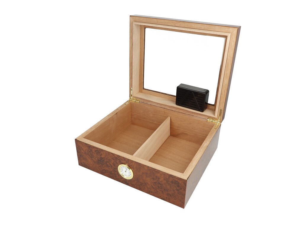Humidor na doutníky s proskleným víkem a kapacitou cca 25 doutníků (v závislosti na velikosti). Prosklený humidor Glasstop ve tmavší hnědé barvě s výraznou kresbou má povrch v lesklém provedení. Prostor pro doutníky je možné rozdělit dle potřeby přiloženou přepážkou. Stolní humidor je vybavený vyměnitelným analogový vlhkoměrem a zvlhčovačem s houbou, který uchytíte v humidoru pomocí přiložených suchých zipů s lepící páskou. Vnitřek humidoru je vyložený cedrovým dřevem, které prospívá skladování doutníků. Poškrábání povrchu, na kterém je humidor položený, zabraňuje jemná sametová látka, kterou je spodní vnější část humidoru vybavena. Humidor je dodávaný v kartonové krabici.