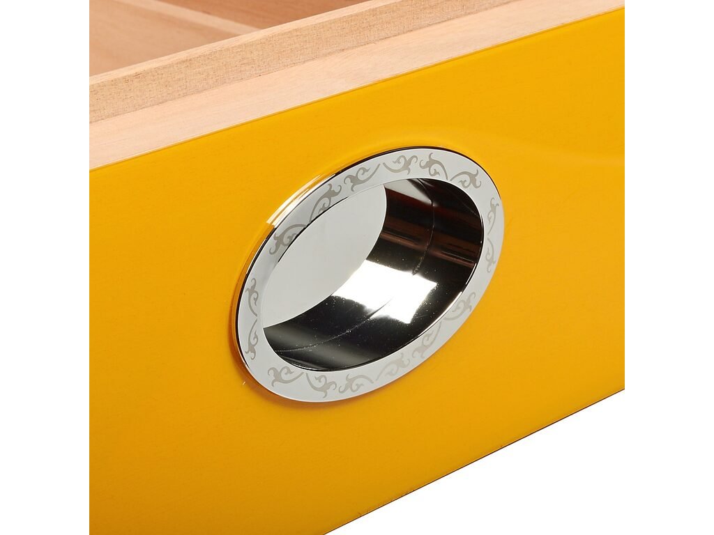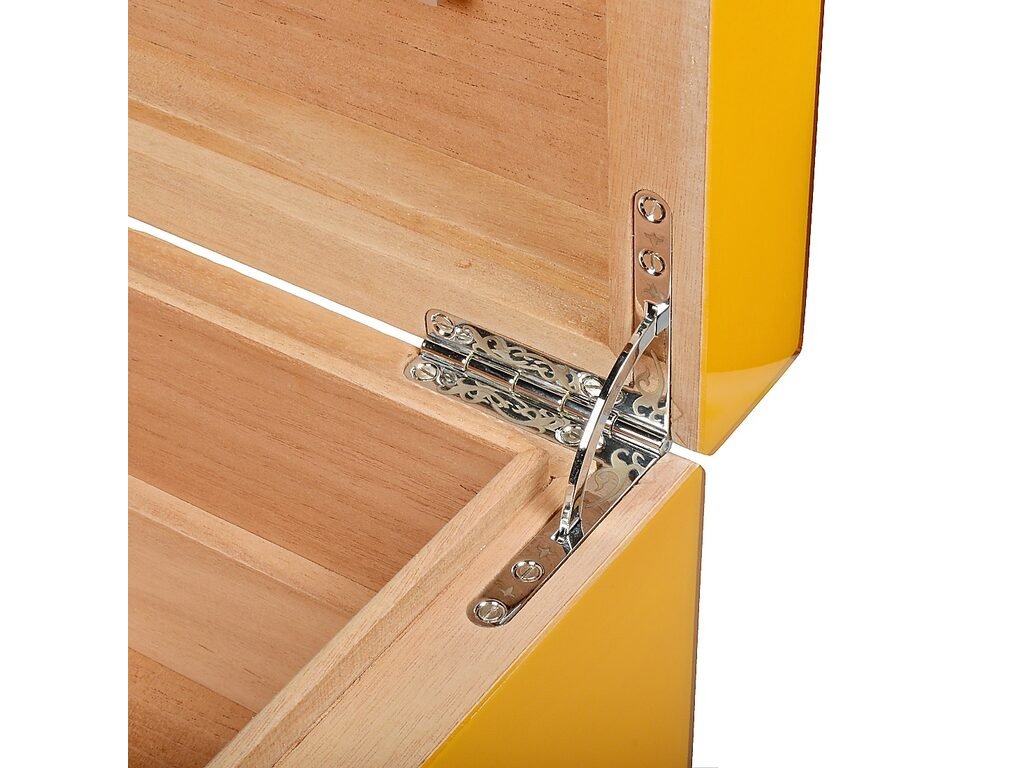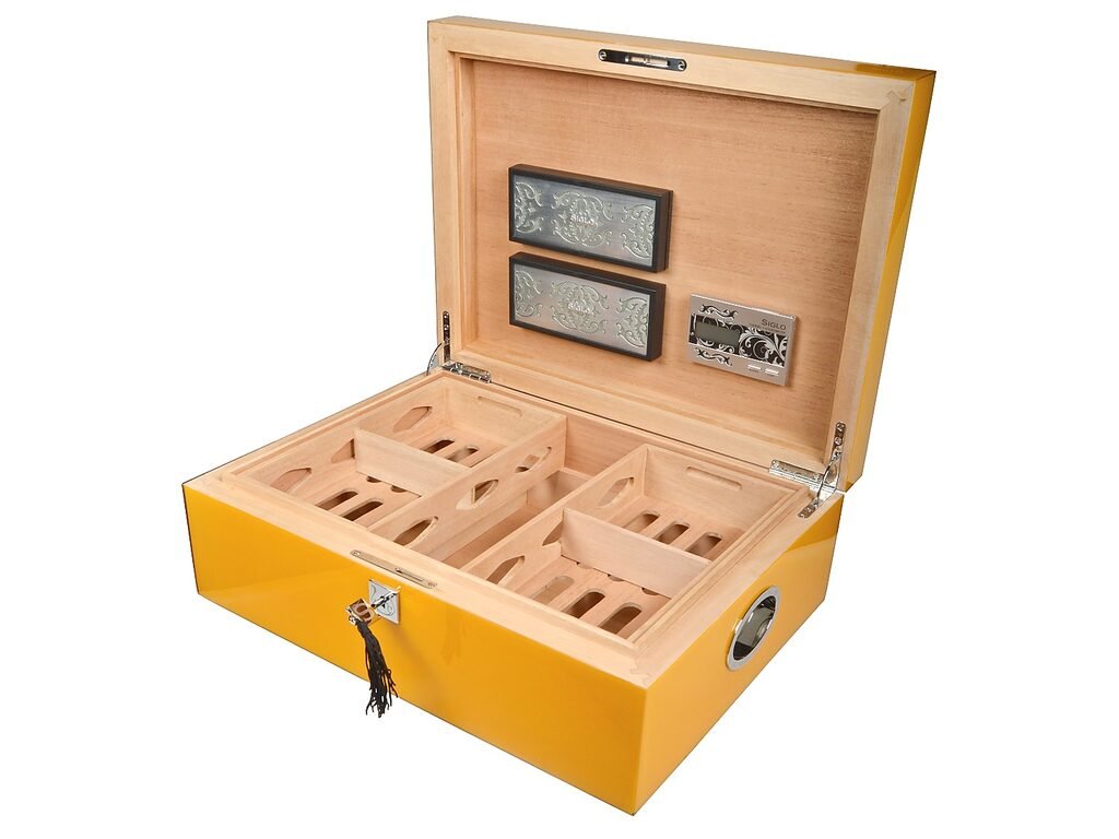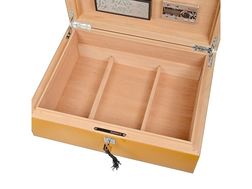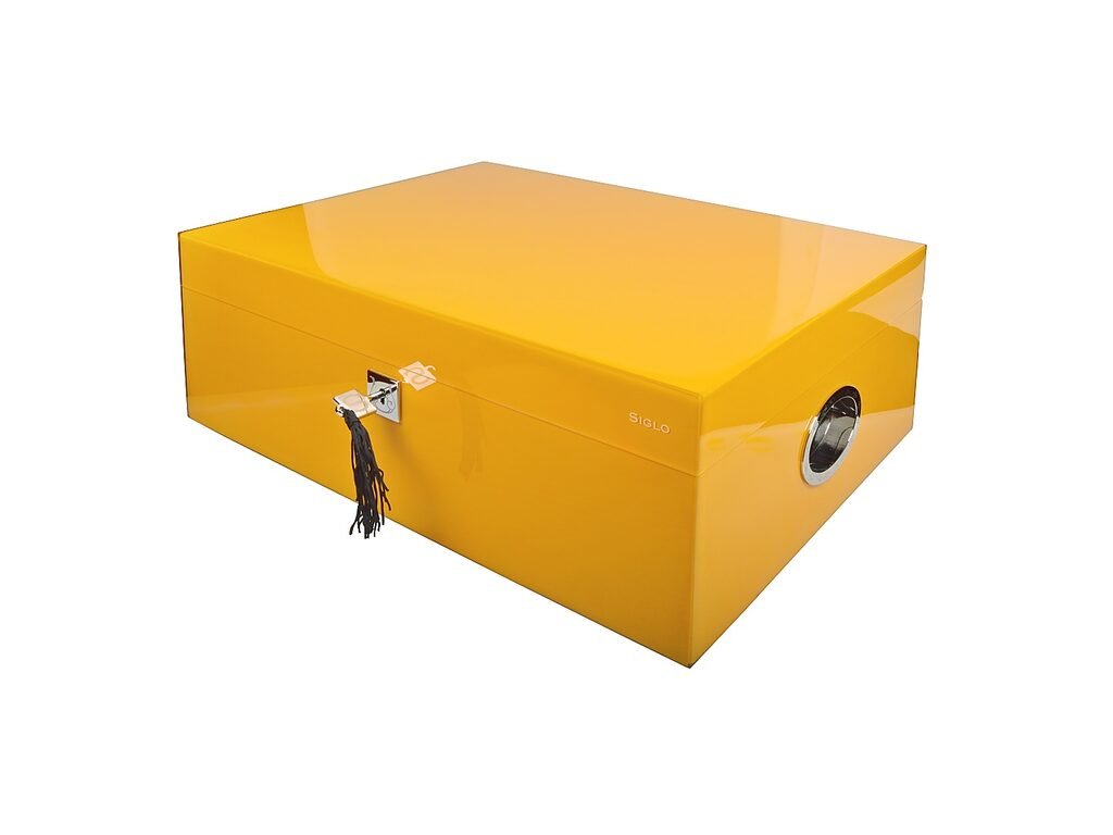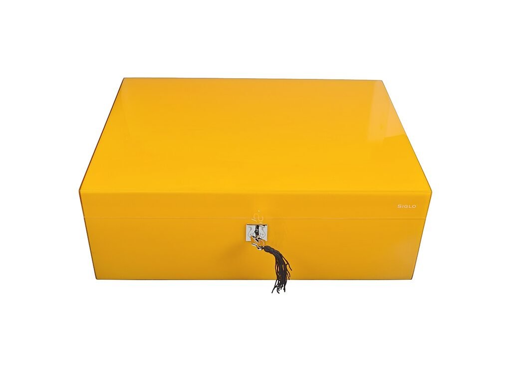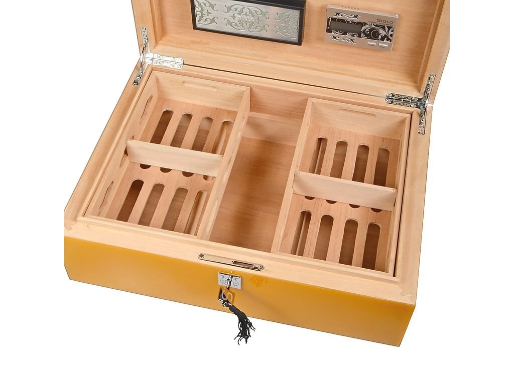 Moderní humidor na doutníky s kapacitou cca 70 - 80 doutníků (v závislosti na velikosti). Uzamykatelný humidor Siglo ve žluté barvě má akrylový povrch v lesklém provedení. Celý humidor je ručně a precizně vyrobený z pravého španělského cedru. Na bocích najdeme zdobená oválná madla, která jsou v chromovém leštěném provedení jako zámek a panty. Doutníky je možné v humidoru skladovat ve dvou patrech. Spodní patro a horní dva vyndavací boxy lze dle potřeby rozdělit přepážkami z cedru. Pohodlné otevíraní víka a uzamčení zajišťují kvalitní celokovové panty a ocelový zámek. Výbornou pevnost humidoru zajišťují celodřevěné rohy spojené dřevěnými klíny. Stolní humidor je vybavený digitálním vlhkoměrem a dvěma zvlhčovači s houbou, které se uchytí pomocí magnetu na vnitřní stranu víka. Vnitřek humidoru je také zpracovaný ze španělského cedrového dřeva, které prospívá skladování doutníků. Poškrábání povrchu, na kterém je humidor položený, zabraňuje jemná sametová látka na spodní části. Humidor Siglo je zabalený v jemné látce a dárkovém boxu a dodávaný v kartonové krabici.
