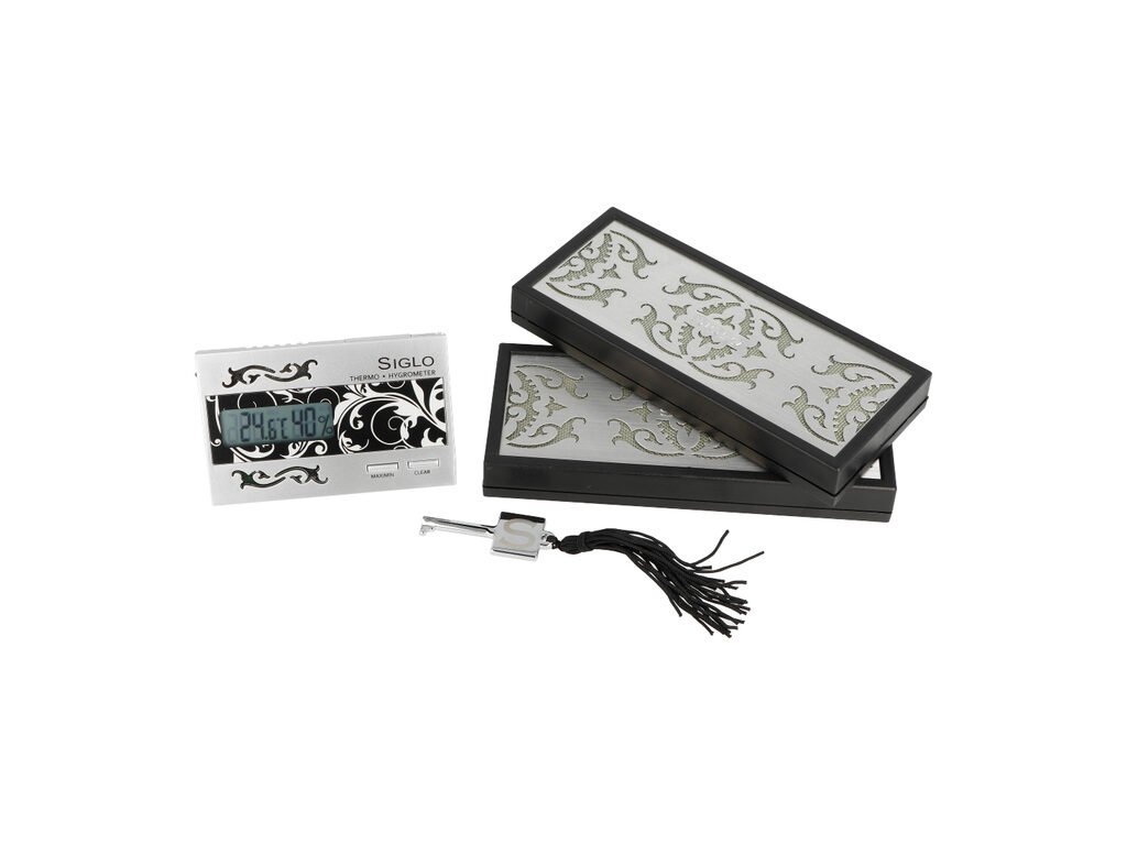 Obsah balení: humidor, 4x přepážka, 1x digitální vlhkoměr(s baterií), 2x zvlhčovač s houbou, 1x klíč