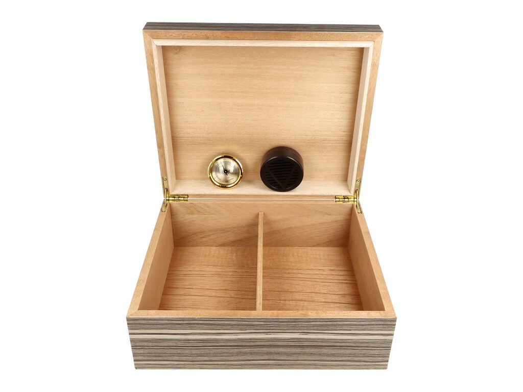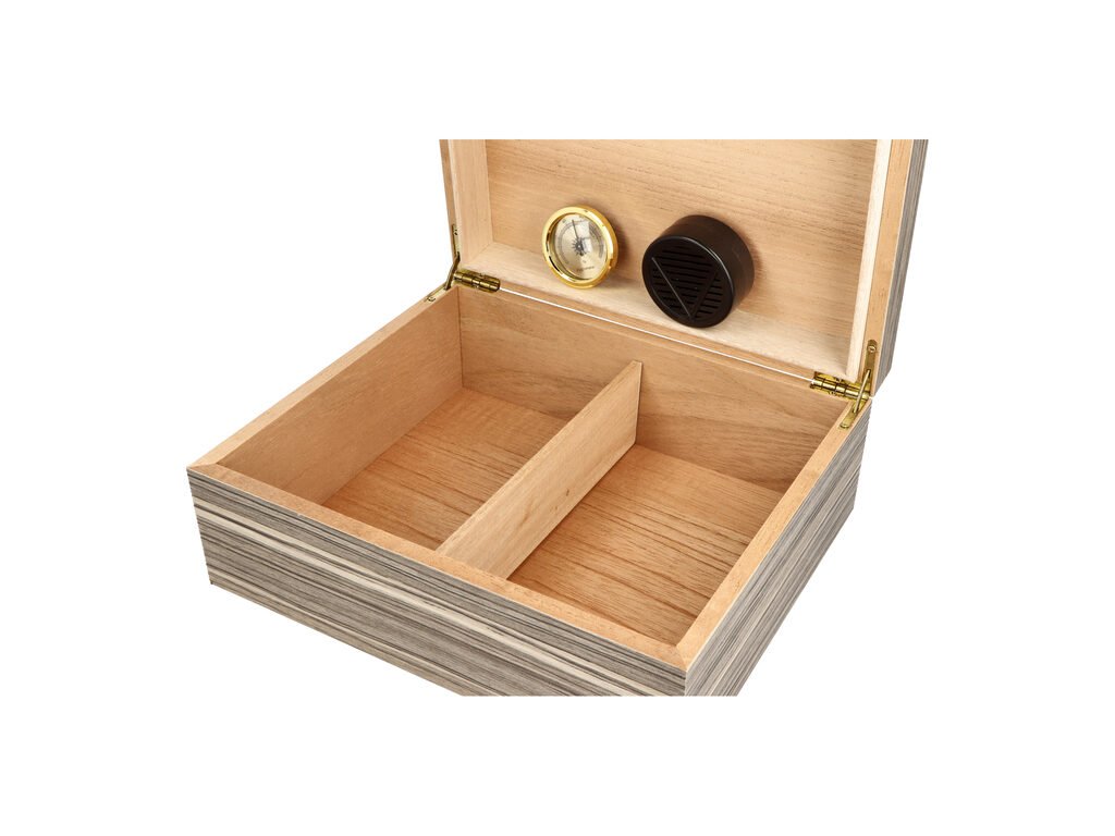 Stolní humidor na doutníky Whited s kapacitou cca na 25 doutníků (v závislosti na velikosti) je atraktivní humidor, který je ve světlejším šedém tónu s výraznou kresbou. Matný povrch humidoru je efektně jemně drážkovaný. Prostor pro doutníky je možné rozdělit dle potřeby přiloženou přepážkou. Humidor je vybavený vyměnitelným vlhkoměrem a polymerovým zvlhčovačem, které uchytíte v humidoru pomocí přiložených samolepících pásků se suchým zipem.