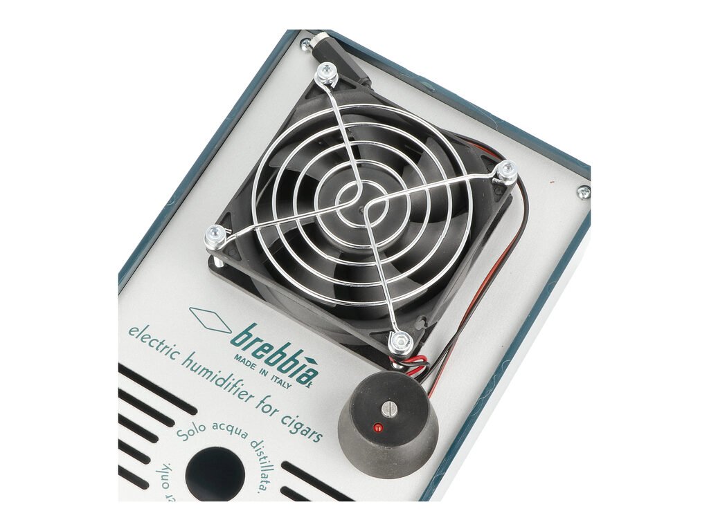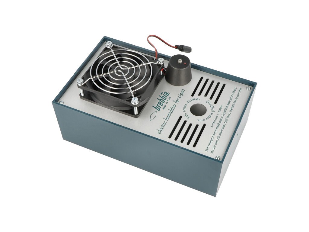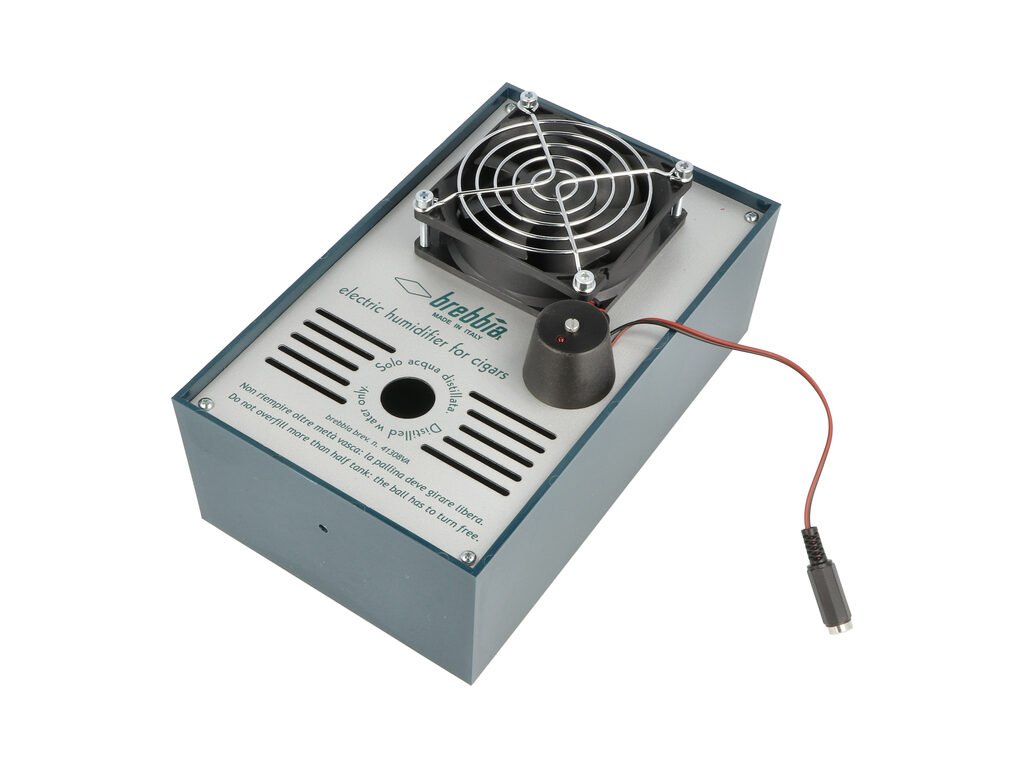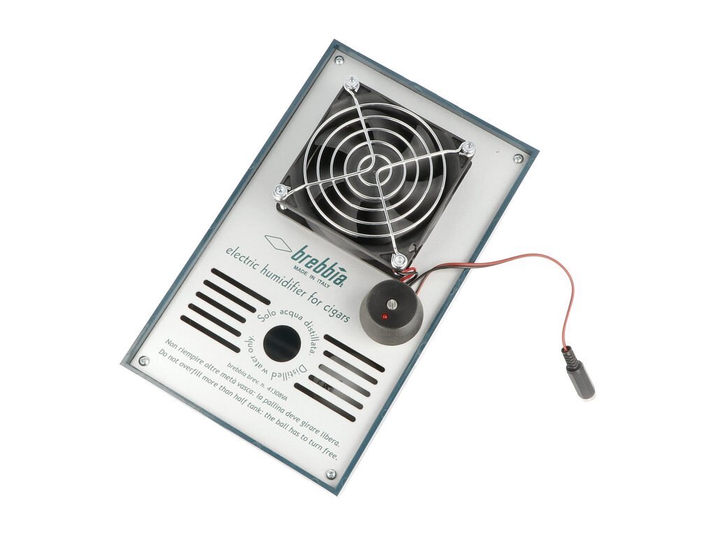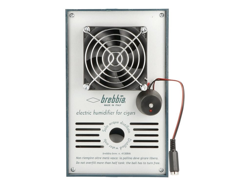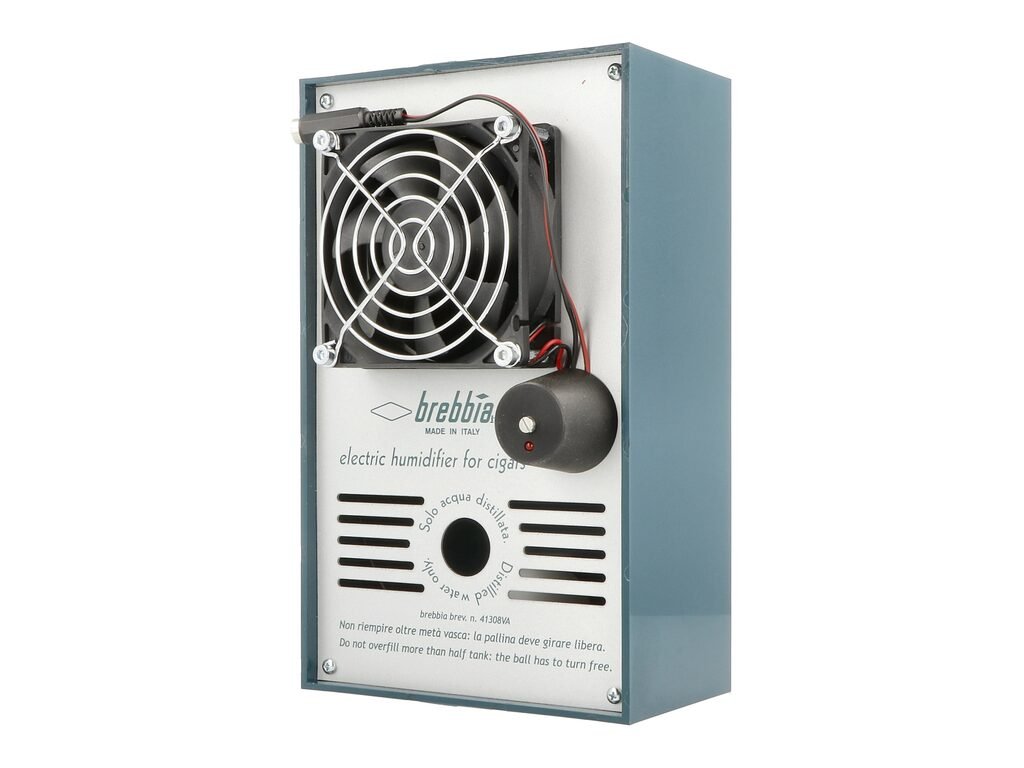 Automatický zvlhčovač Brebbia do humidoru s možností nastavení udržované vlhkosti. Elektrický zvlhčovač Brebbia je určený pro velké skříňové humidory s objemem do 2 metrů kubických, kterým poskytne konzistentní dlouhodobou kontrolu vlhkosti bez údržby. Patentovaný elektrický zvlhčovač je vybavený ventilátorem, který roztáčí plastovou "kuličku" na hladině vody.
