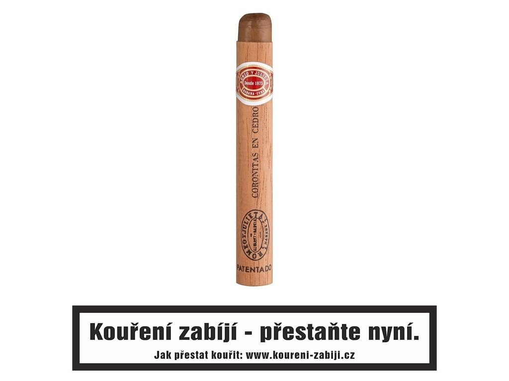 Kubánské doutníky Romeo y Julieta Coronitas en Cedro. Chuťově výborné ručně balené doutníky ve slabém cedrovém obalu. Jemnější doutníky Coronitas en Cedro charakterizuje bohatá a plná chuť. Oblíbené jsou u všech kuřáků, kteří vyznávají spíše lehčí a lahodnější doutníky. Typické pro tyto kratší ne moc silné doutníky Coronitas jsou velmi jemné tóny čokolády, vanilky s příjemným nádechem bylin a jemnou vůní cedru. Doba hoření je cca 30-50 minut. Doutníky jsou balené po 25 ks v cedrovém proužku a v originální cedrové krabici Romeo y Julieta. Prodávají se pouze po celém balení.