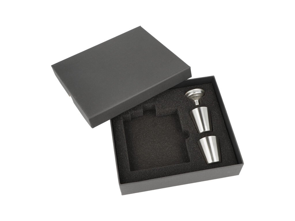 Dárková kazeta na placatku s objemem 6oz s pohárky a nálevkou. Kartonová krabička s molitanovou výplní a výřezem pro placatku obsahuje dva nerezové pohárky a nálevku. Dárková sada neobsahuje placatku.