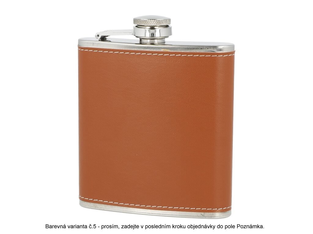 Nerezová placatka na alkohol. Likérka je vyrobená z nerezové oceli s leštěným povrchem. Tělo placatky je potažená koženkou v různém provedení. Likérka klasického prohnutého tvaru je vybavená šroubovacím uzávěrem a držákem víčka, který zabrání jeho ztrátě. Cena je uvedena za 1 ks. Před odesláním objednávky uveďte číslo barevného provedení do poznámky.