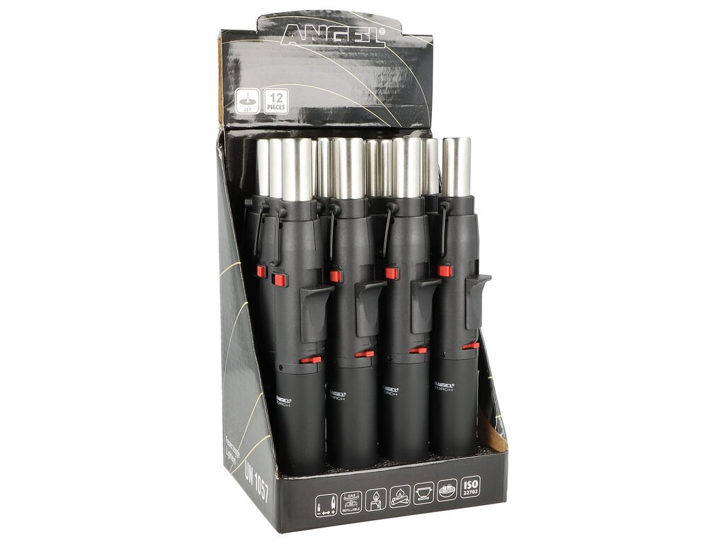 Plynový domácnostní zapalovač Angel BBQ s tryskovým plamenem a stojánkem. Turbo zapalovač je vhodný pro zapalování sporáků, svíček, ale také díky jedné silné trysce, která vyvine silný plamen k zapálení uhlíků do vodní dýmky, krbů, doutníků nebo také k přípravě pokrmů. Posunem horního tlačítka nahoru zapálíme plamen. Pojistka na těle zapalovače zabrání nechtěnému zapálení. Praktický stojánek poslouží k opření zapalovače. Povrch zapalovače je v černém matném provedení. Dále na zapalovači najdeme nastavení intenzity plamene a ve spodní části plnicí ventil. Díky jeho tvaru se dostanete i na hůře přístupná místa pod hrnec apod. Prodej pouze po celém balení (displej) 12 ks.