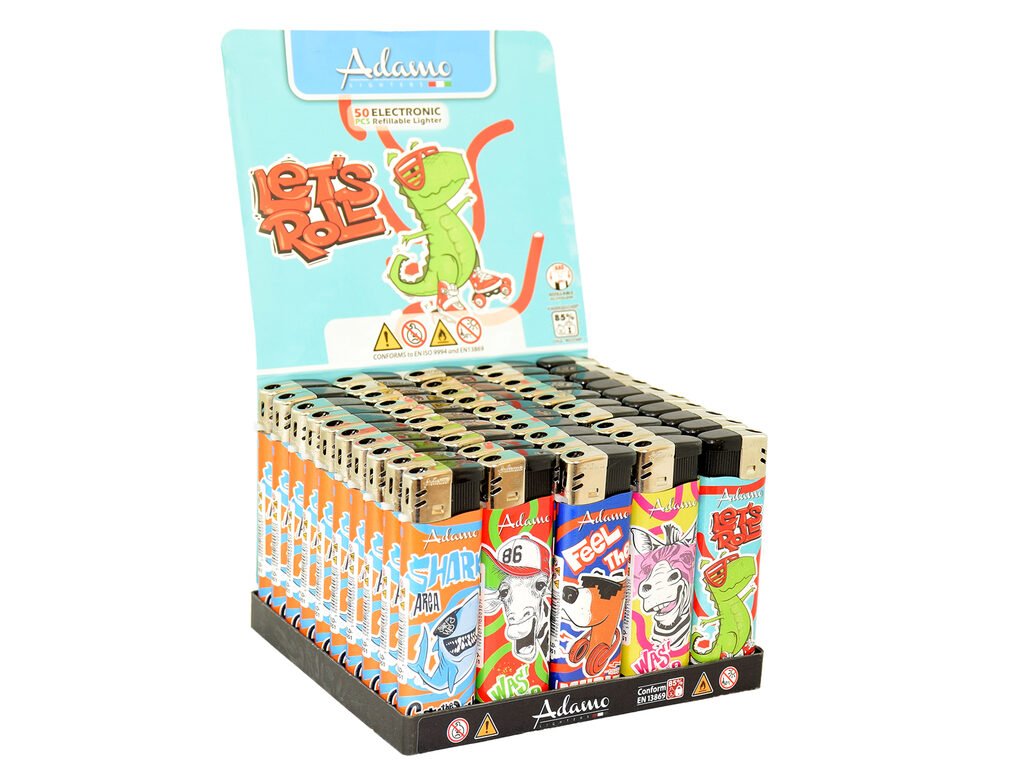 Plynový zapalovač Adamo Piezo Cool Animals II. Plnitelný zapalovač s možností nastavení výšky plamene. Prodej pouze po celém balení (displej) 50 ks. Výška zapalovače 8 cm.