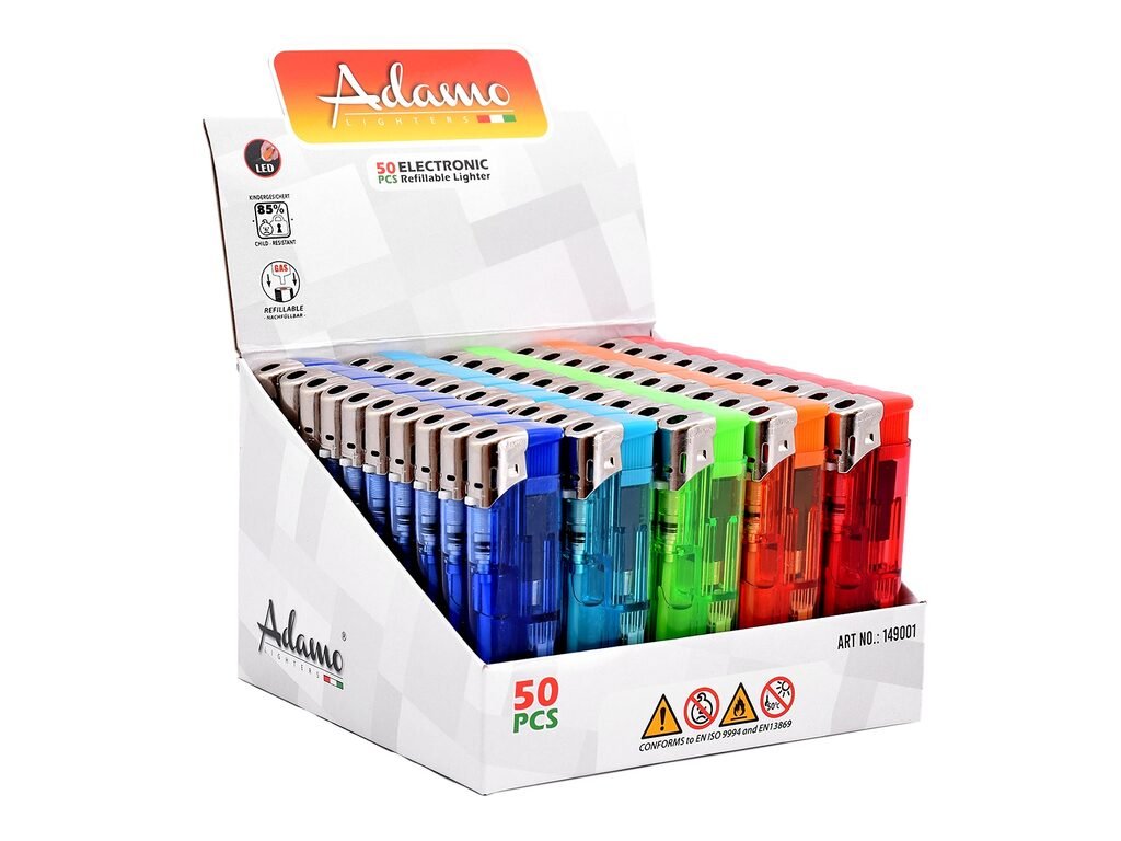 Plynový zapalovač Adamo Piezo LED transparent se světlem LED. Plnitelný zapalovač je vybavený nastavením intenzity plamene. Prodej pouze po celém balení (displej) 50 ks. Výška zapalovače 8 cm.