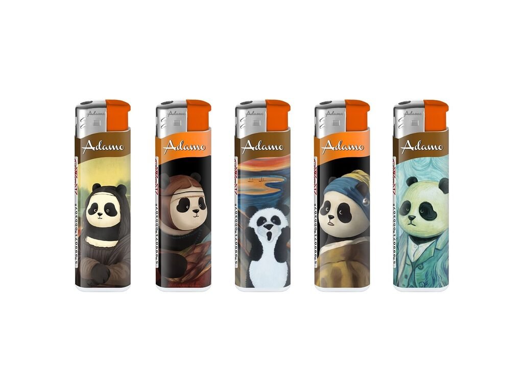 Plynový zapalovač Adamo Piezo Panda Painting. U zapalovače nelze měnit výšku plamene, zapalovač není plnící. Prodej pouze po celém balení (displej) 50 ks. Výška zapalovače 8 cm.