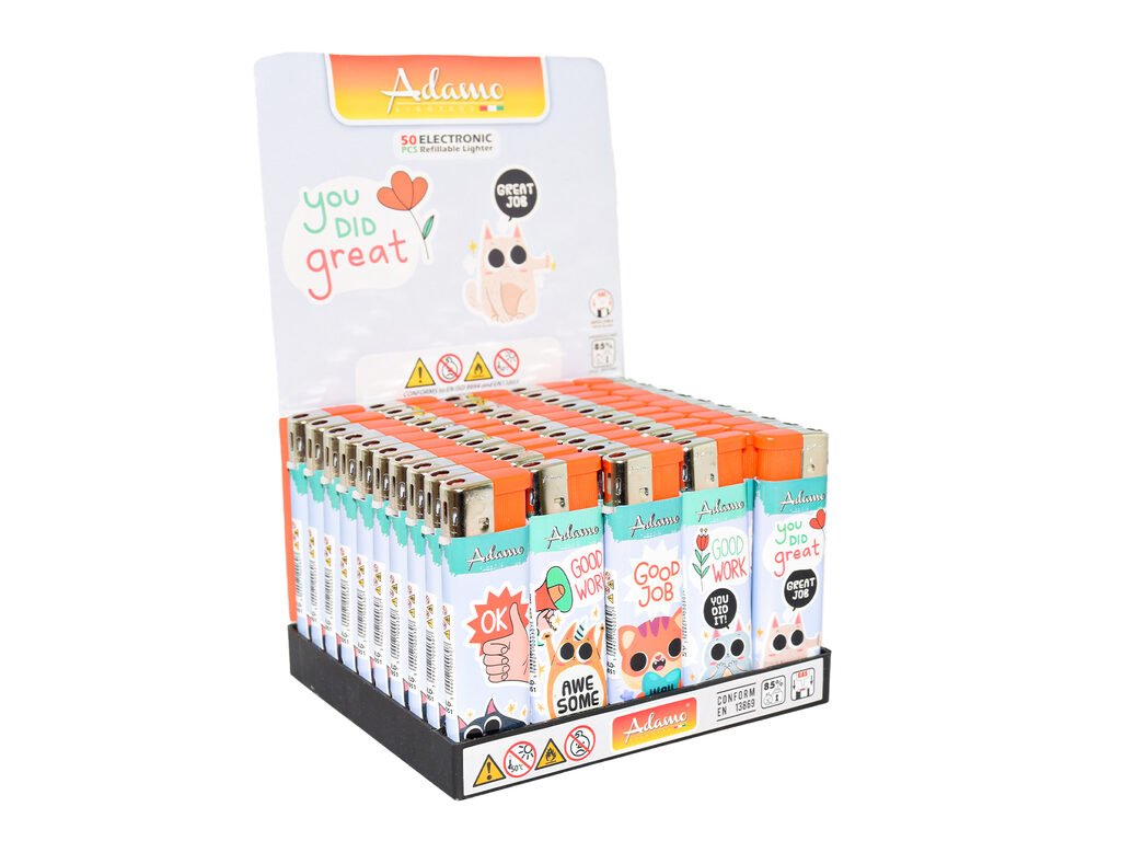 Plynový zapalovač Adamo Piezo Positive Animals. Plnitelný zapalovač s možností nastavení výšky plamene. Prodej pouze po celém balení (displej) 50 ks. Výška zapalovače 8 cm.