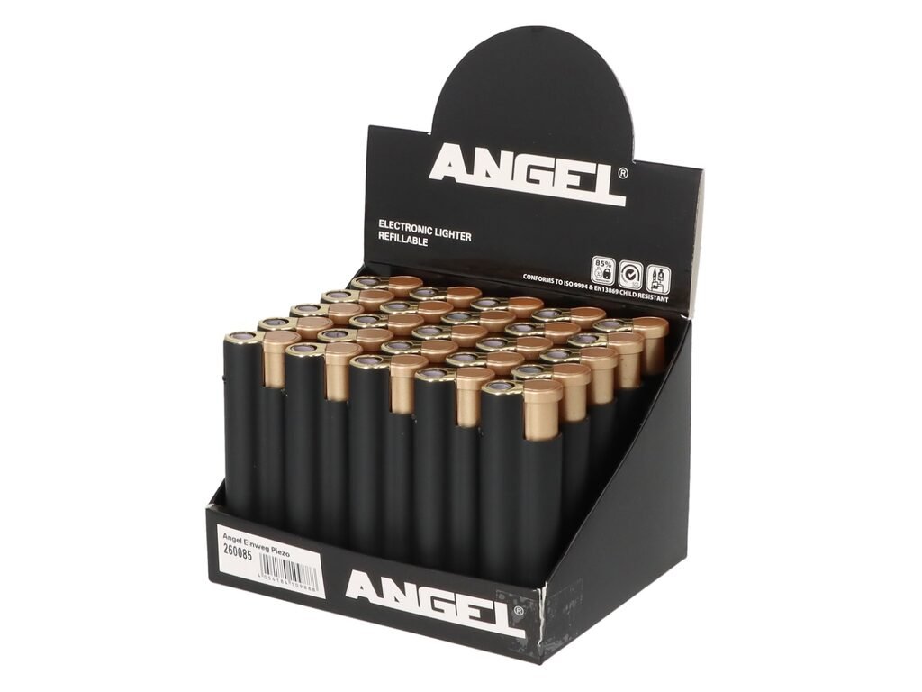 Plynový zapalovač Angel s pogumovaným povrchem. Kovový plnitelný turbo zapalovač s možností nastavení výšky plamene. Prodej pouze po celém balení (displej) 25 ks. Výška zapalovače 7,8 cm.