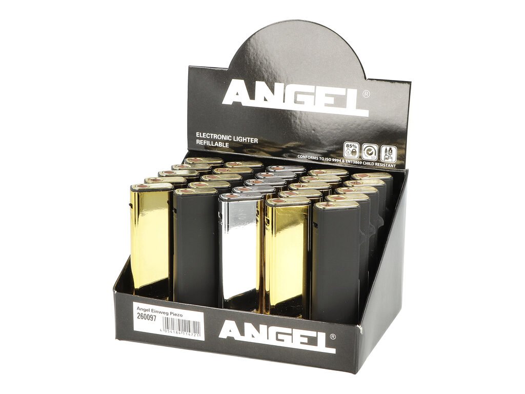 Plynový zapalovač Angel. Plnitelný kovový turbo zapalovač s možností nastavení výšky plamene. Prodej pouze po celém balení (displej) 25 ks. Výška zapalovače 8,3 cm.