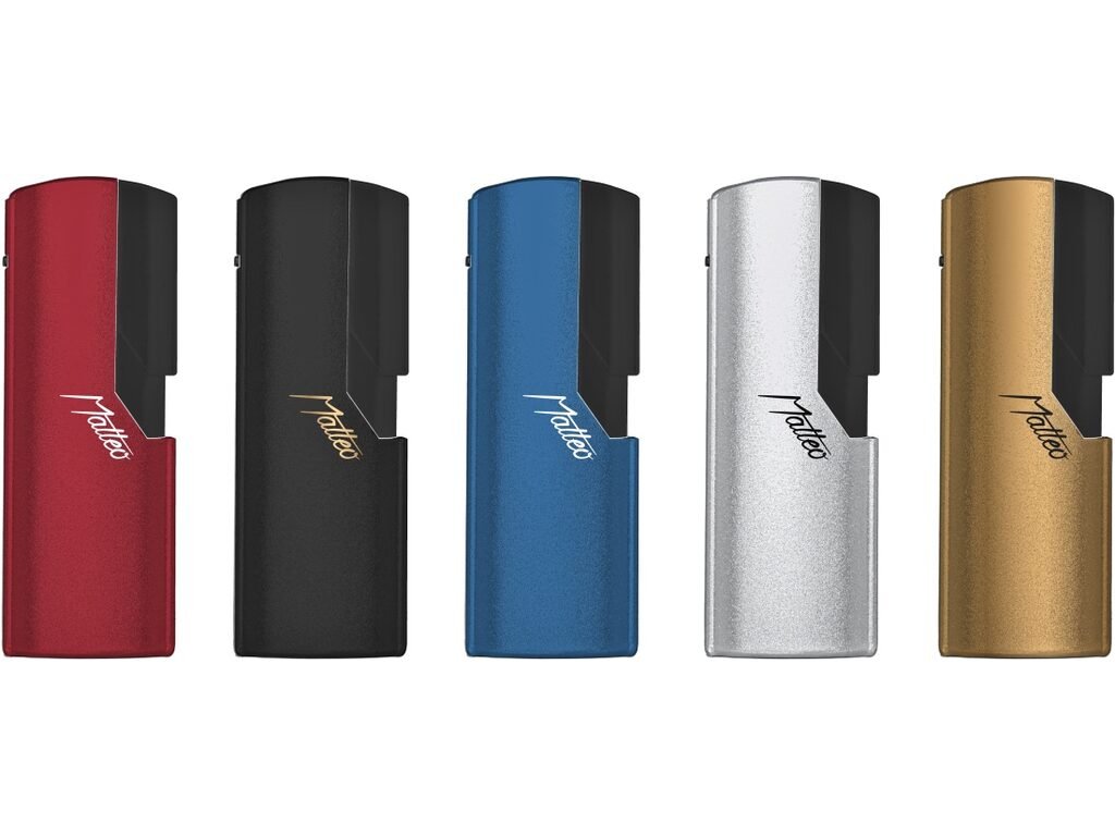 Tryskový zapalovač Matteo. Plnitelný kovový turbo zapalovač s možností nastavení výšky plamene. Prodej pouze po celém balení (displej) 25 ks. Výška zapalovače 8,2 cm.
