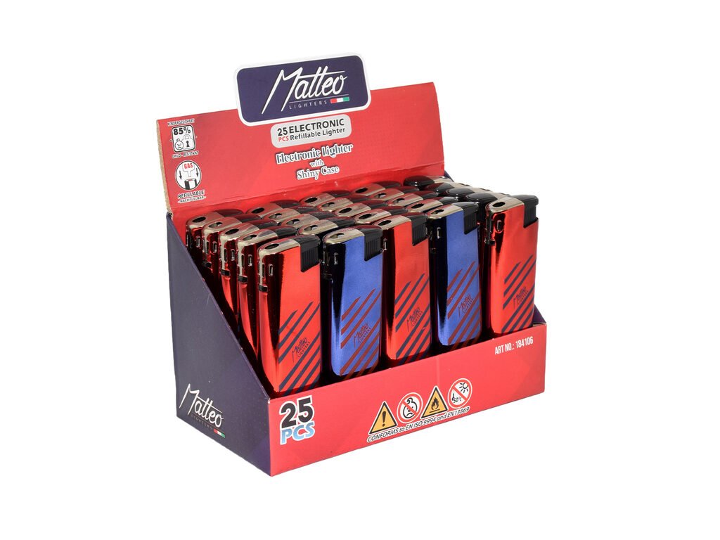 Plynový zapalovač Matteo Metal Elegant s lesklým povrchem. Plnitelný kovový zapalovač s možností nastavení výšky plamene. Prodej pouze po celém balení (displej) 25 ks. Výška zapalovače 8,3 cm.
