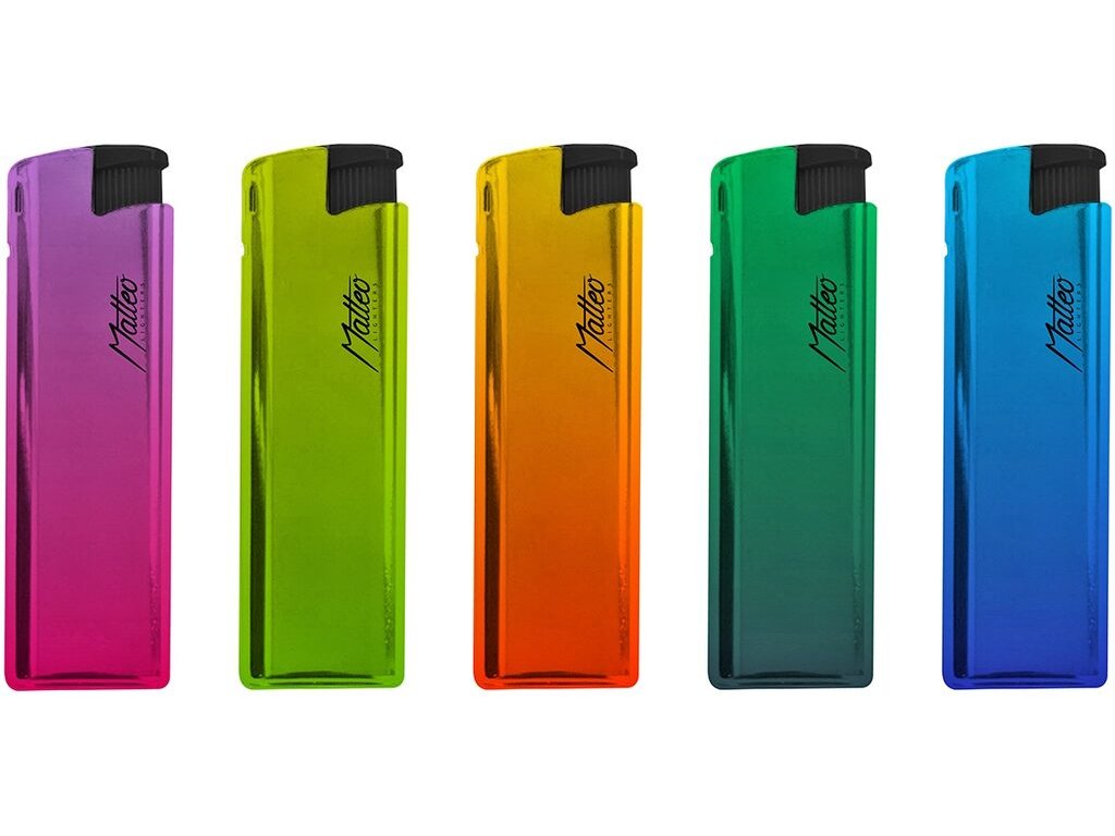 Plynový zapalovač Matteo Metal Solid Gradient I s lesklým povrchem. Plnitelný kovový zapalovač s možností nastavení výšky plamene. Prodej pouze po celém balení (displej) 25 ks. Výška zapalovače 8,1 cm.