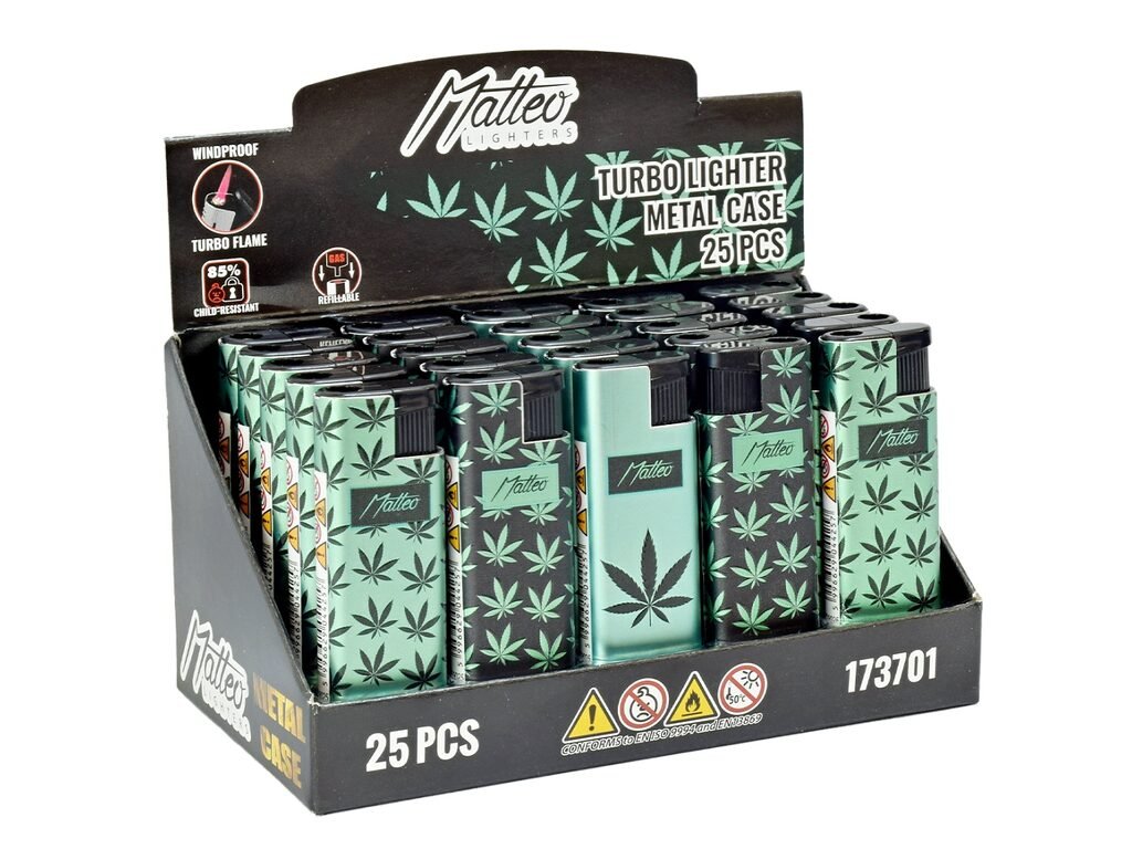 Plynový žhavící zapalovač Matteo. Plnitelný kovový turbo zapalovač bez možnosti nastavení výšky plamene. Prodej pouze po celém balení (displej) 25 ks. Výška zapalovače 7,7 cm.