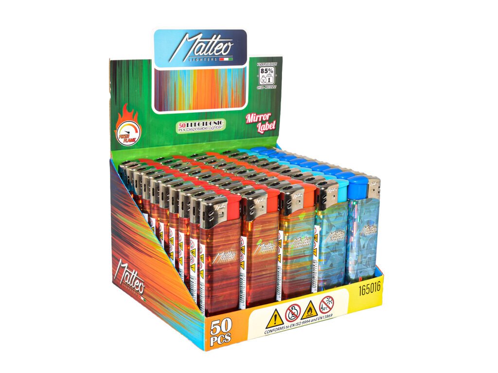Plynový zapalovač Matteo Piezo Mirror Red&Blue. U zapalovače nelze měnit výšku plamene, zapalovač není plnící. Prodej pouze po celém balení (displej) 50 ks. Výška zapalovače 8 cm.