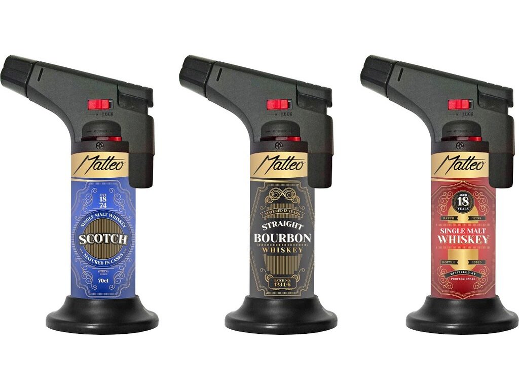 Tryskový zapalovač Torch Whiskey Label. Díky jedné silné trysce, která vyvine silný plamen je turbo zapalovač je vhodný k zapálení uhlíků do vodní dýmky, kuřiva do bongů, krbů, doutníků nebo také k přípravě pokrmů. Na čelní straně najdeme nastavení intenzity plamene a pojistku proti zapálení. Na spodní straně zapalovače je umístěný plynový plnící ventil. Jeho stabilitu zajišťuje kruhová základna, do které se zasune. Prodej pouze po celém balení (displej) 12 ks.