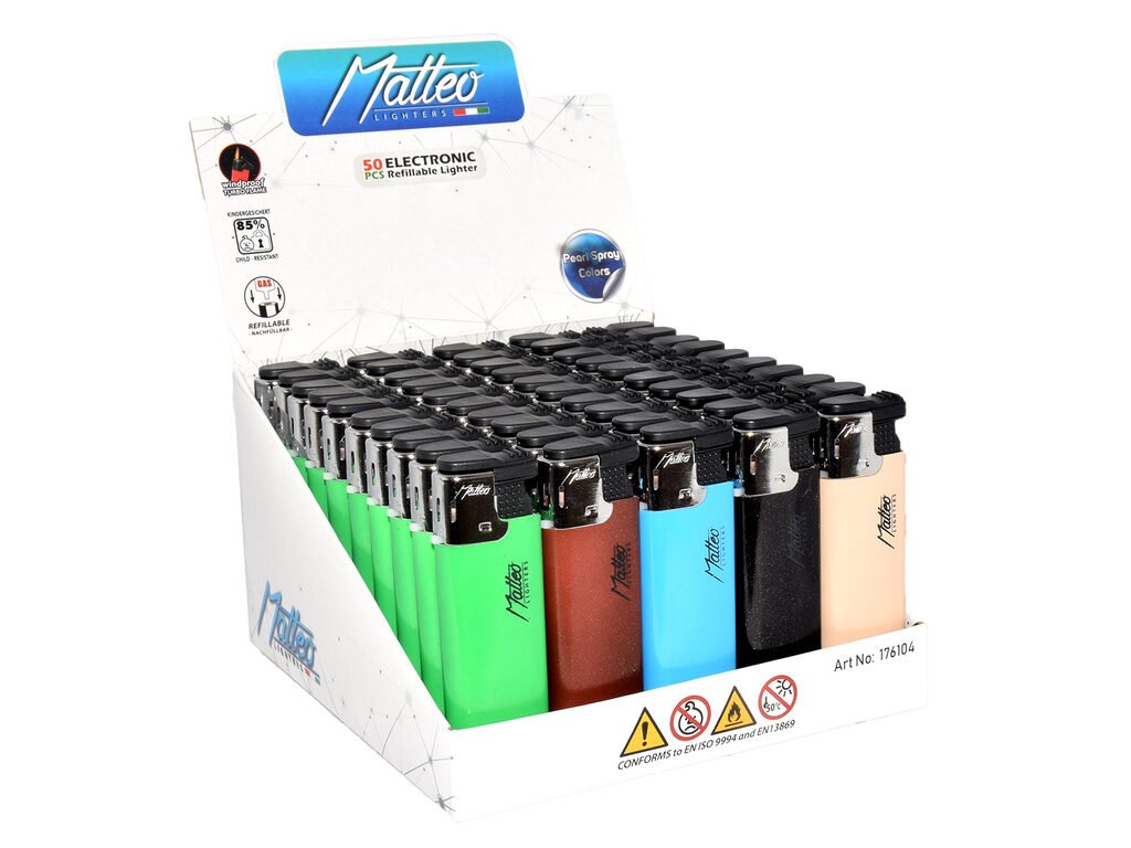 Plynový žhavící zapalovač Matteo Turbo Pearl Spray. Plnitelný turbo zapalovač s možností nastavení výšky plamene. Prodej pouze po celém balení (displej) 50 ks. Výška zapalovače 8 cm.