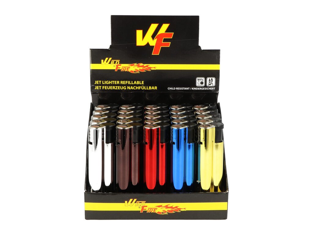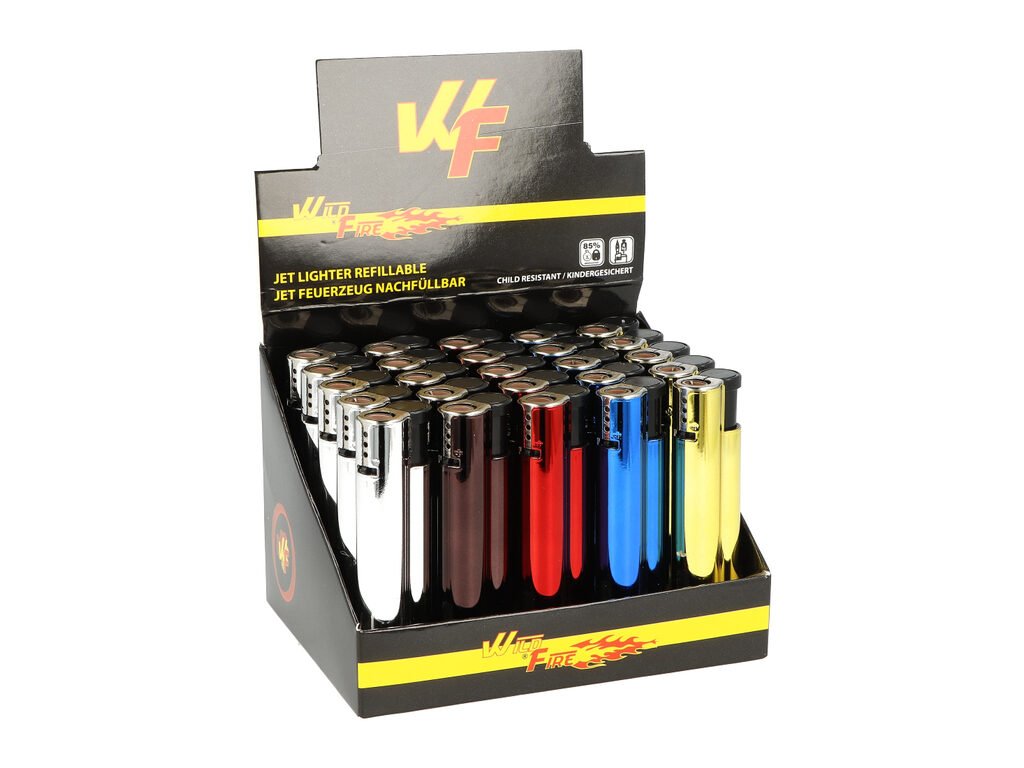 Kovový zapalovač Wildfire Metal Classic. Plnitelný turbo zapalovač s možností nastavení výšky plamene. Prodej pouze po celém balení (displej) 25 ks. Výška zapalovače 7,8 cm.