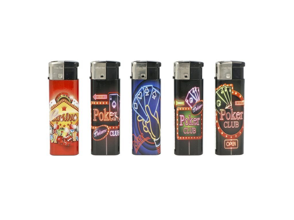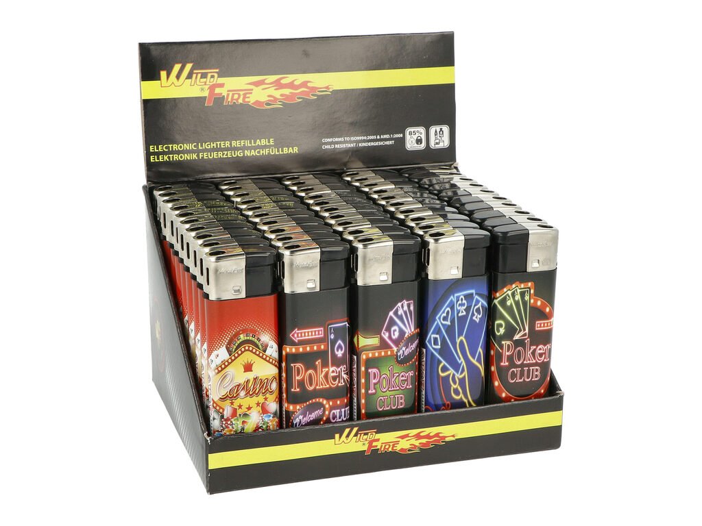Plynový zapalovač Wildfire Piezo Casino. Plnitelný zapalovač je vybavený nastavením intenzity plamene. Prodej pouze po celém balení (displej) 50 ks. Výška zapalovače 8 cm.