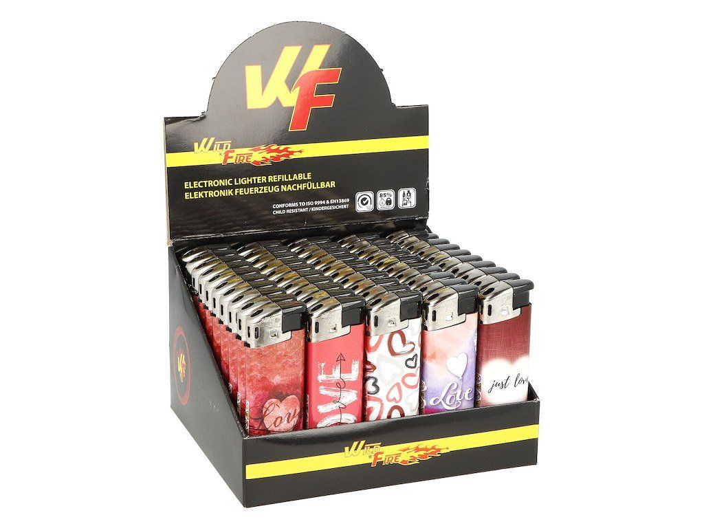 Plynový zapalovač Wildfire. Plnitelný zapalovač s možností nastavení výšky plamene. Prodej pouze po celém balení (displej) 50 ks. Výška zapalovače 8 cm.