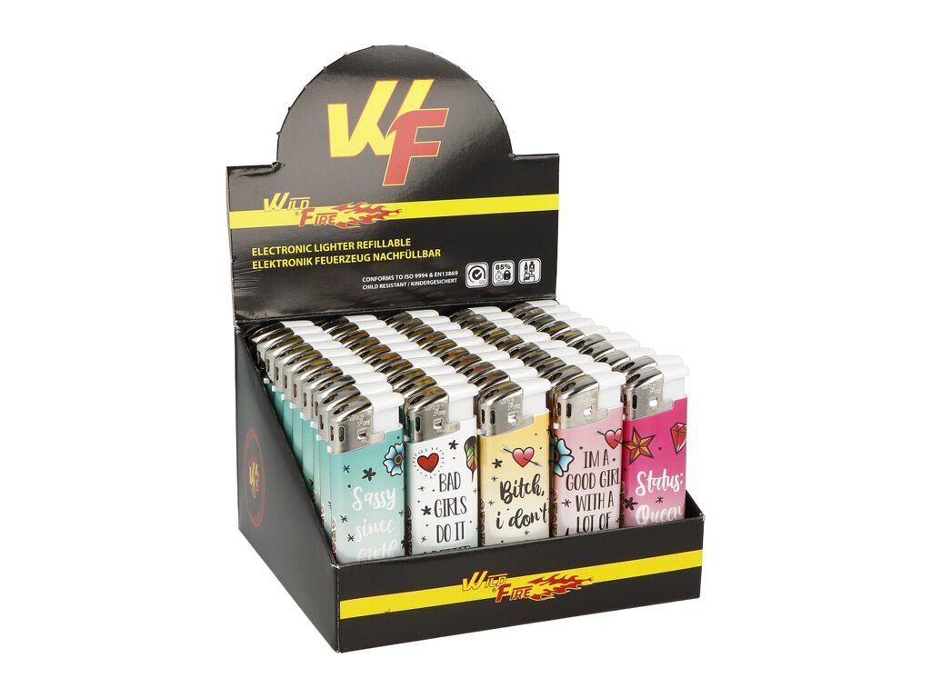 Plynový zapalovač Wildfire. Plnitelný zapalovač s možností nastavení výšky plamene. Prodej pouze po celém balení (displej) 50 ks. Výška zapalovače 8 cm.