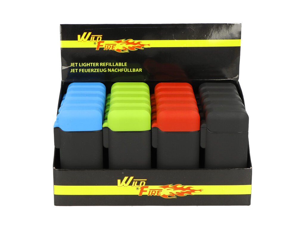 Plynový zapalovač Wildfire Rubber. Plnitelný turbo zapalovač bez možnosti nastavení výšky plamene. Prodej pouze po celém balení (displej) 20 ks. Výška zapalovače 7 cm.