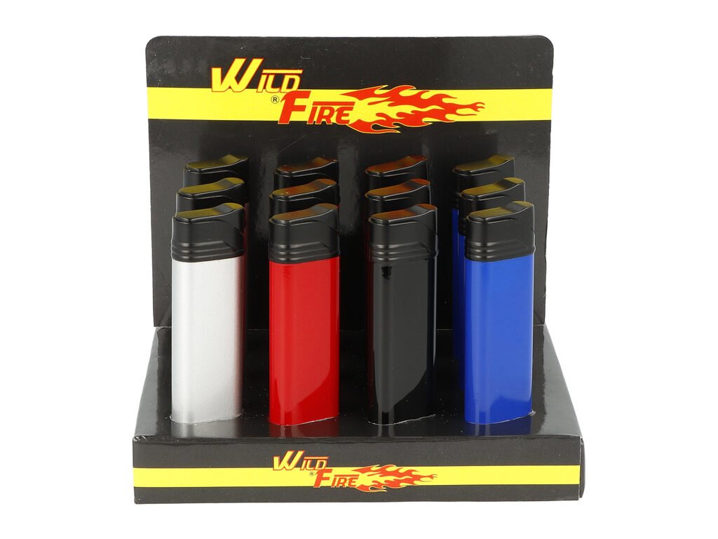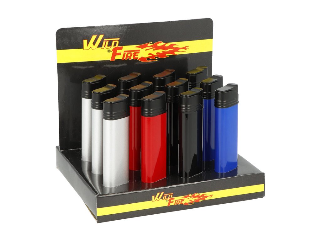 Tryskový zapalovač Wildfire Stick. Plnitelný turbo zapalovač s možností nastavení výšky plamene. Prodej pouze po celém balení (displej) 12 ks. Výška zapalovače 8,3 cm.