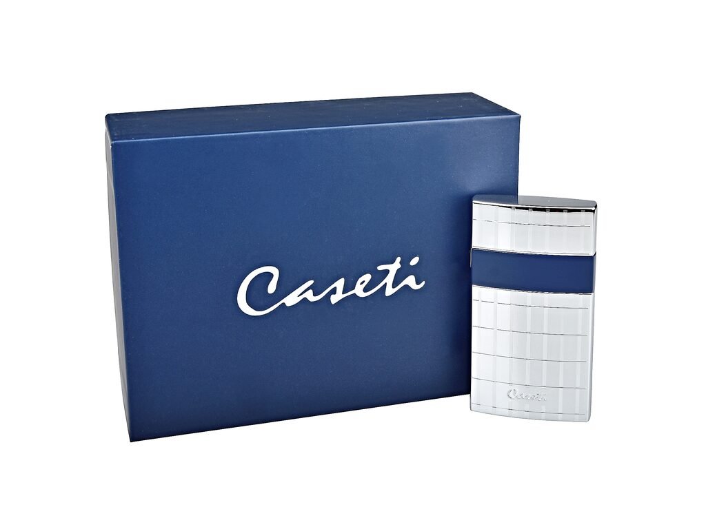 Elegantní tryskový zapalovač Caseti je kvalitně zpracovaný kovový turbo zapalovač, který má povrch v lesklém chromovém provedení zdobený jemnými gravírovanými proužky a modrým pruhem po obvodu.