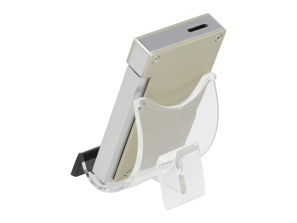 Na boční straně najdeme okénko, kterým můžete kdykoliv zkontrolovat hladinu plynu. Přední efektně žebrovanou stranu doplňuje zadní hladká strana s malými chromovými imbusy. Po stisknutí bočního tlačítka dojde k zapálení jedné trysky, která vytvoří výše zmíněný silný plochý plamen, který dokonale zapálí váš doutník. Na spodní straně zapalovače najdeme nastavení intenzity plamene a plnící ventil. Zapalovač Porsche Design je dodáván v dárkové krabičce s logem. Rozměry: 6,8x3,8x1,1cm.