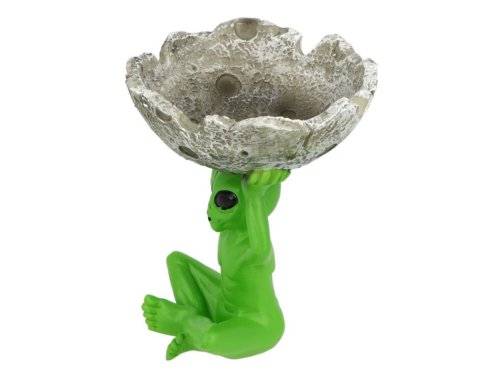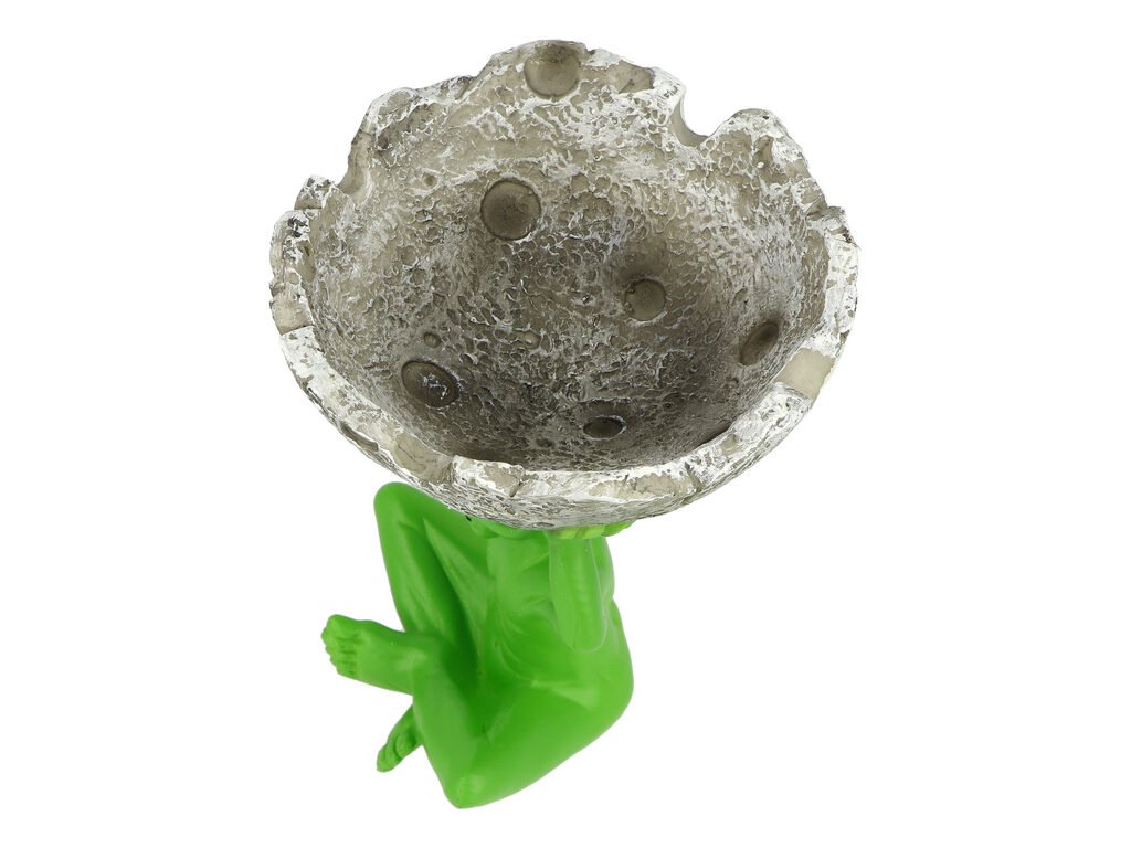Venkovní cigaretový popelník Alien UFO. Polyresinový popelník v designu Aliena je v zelené barvě. Polyresin je druh pryskyřice, která je odolná vůči mechanickému poškození a vlivům počasí. Díky použitému materiálu je popelník vhodný nejen do interiéru, ale také současně pro venkovní použití. Popelník je vybavený čtyřmi odklady pro cigaretu. Popelník je dodávaný v kartonové krabici.