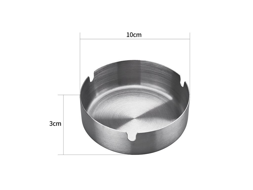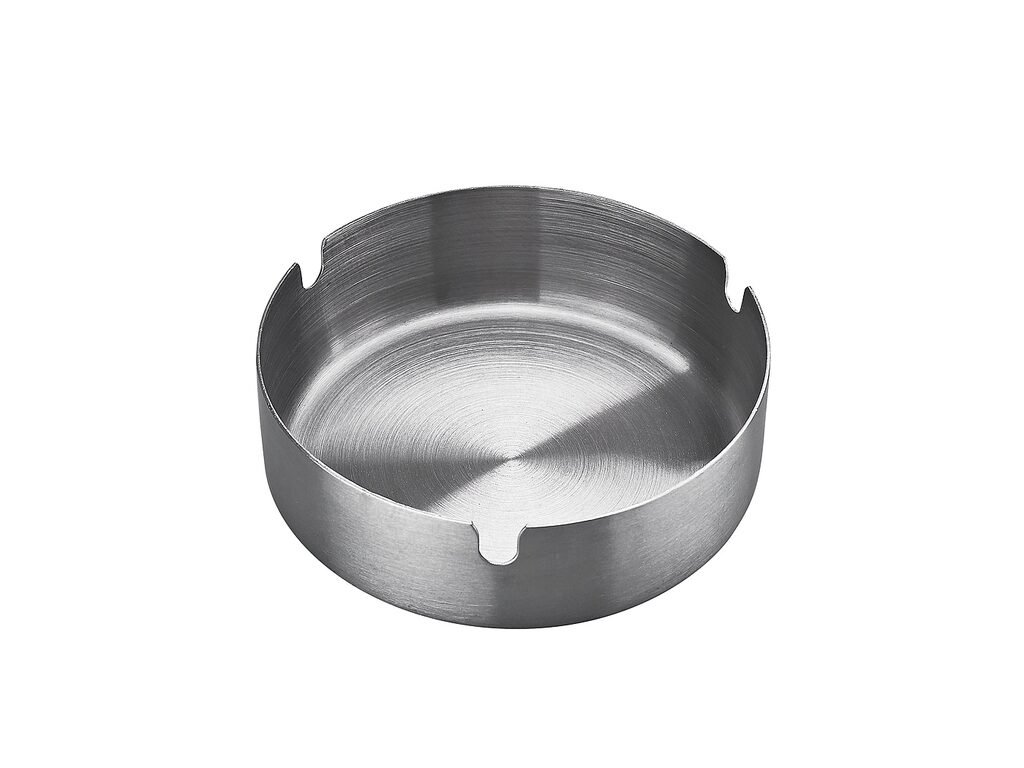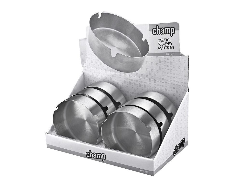 Kovový cigaretový popelník Champ Metal. Kulatý popelník na cigarety se třemi odkládacími místy má jemně broušený povrch. Popelník je vyrobený z plechu tloušťky 0,8 mm. Cena je uvedena za 1 ks.