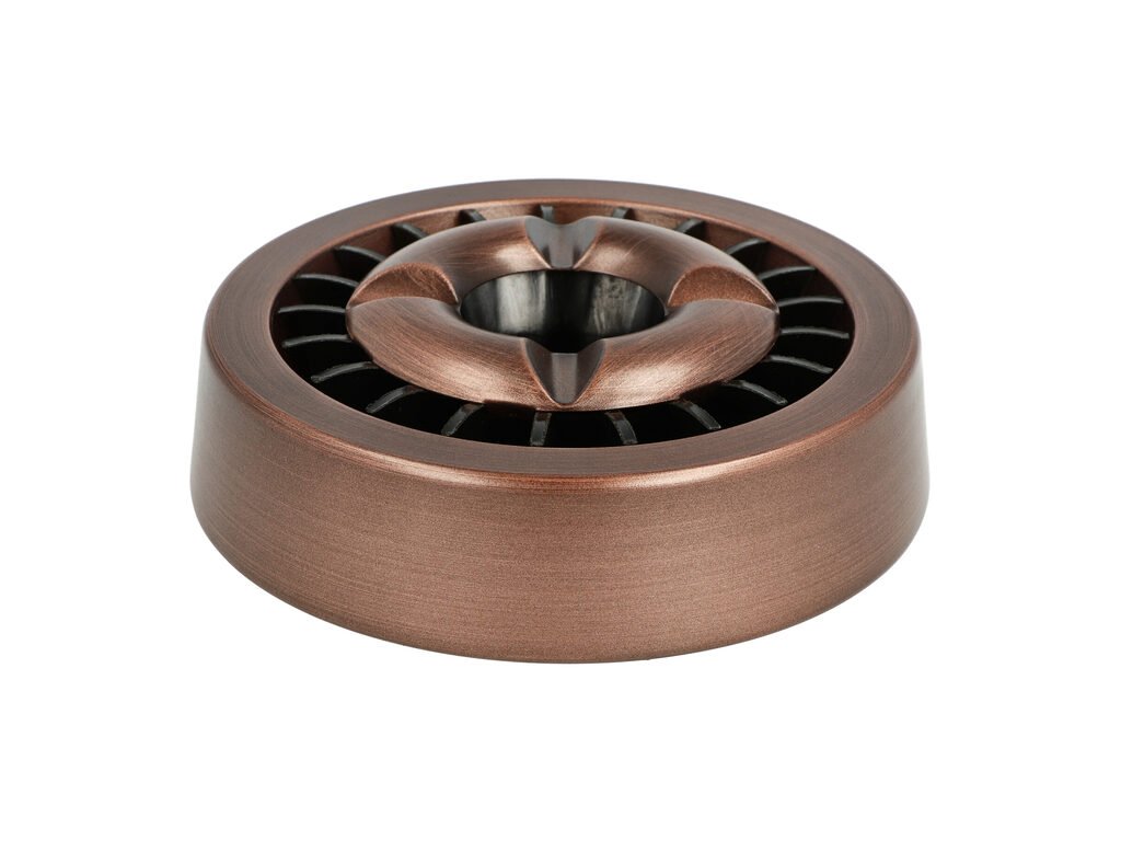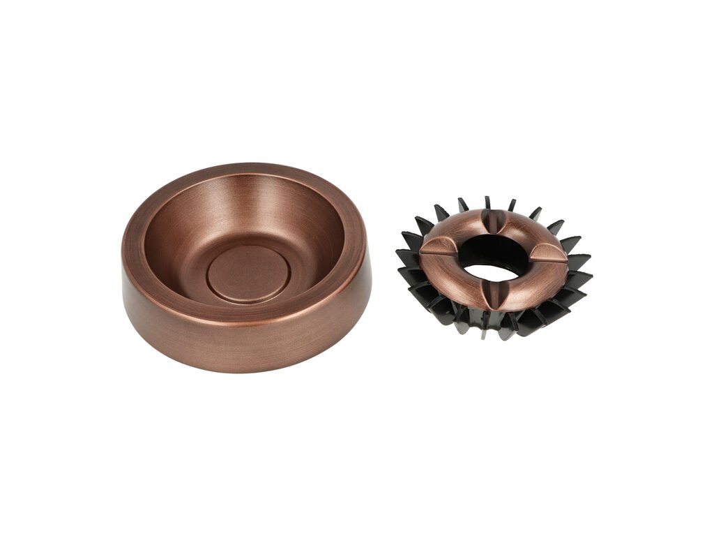 Cigaretový popelník Copper. Kovový popelník v měděném provedení má odklad na čtyři cigarety. Dvoudílný popelník je též vhodný pro venkovní použití. Průměr popelníku je 14cm, výška 4,3cm.