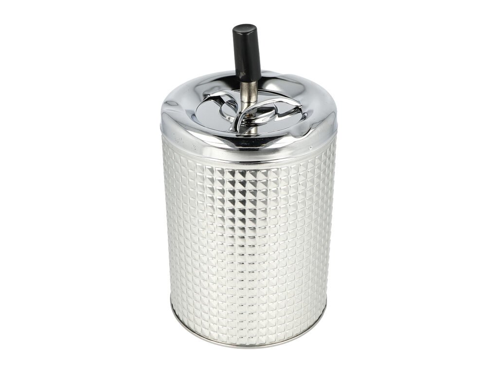 Velký cigaretový popelník otočný Biggy. Samozhášecí venkovní popelník na cigarety je ve stříbrné barvě s chromovým víčkem. Popelník je vybavený třemi odklady pro cigaretu. Kovový popelník je dodávaný v kartonové krabičce.