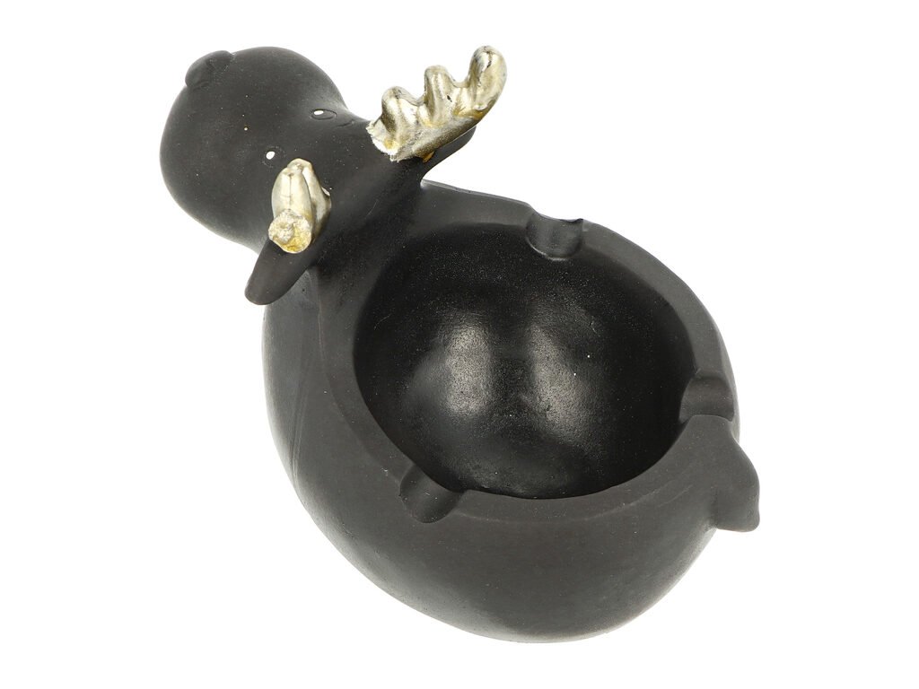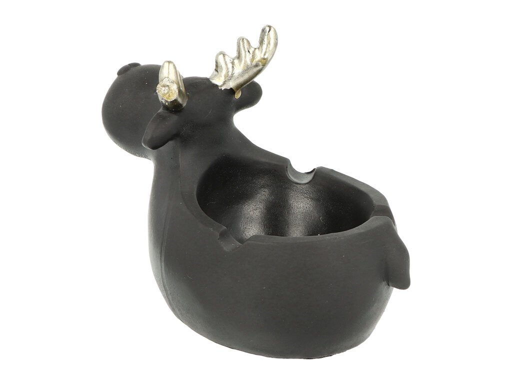 Venkovní cigaretový popelník Moose Black. Polyresinový popelník v černé barvě je v atraktivním designu losa. Polyresin je druh pryskyřice, která je odolná vůči mechanickému poškození a vlivům počasí. Díky použitému materiálu je popelník vhodný nejen do interiéru, ale také současně pro venkovní použití. Popelník je vybavený třemi odklady pro cigaretu. Popelník je dodávaný v kartonové krabici.