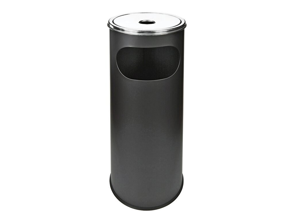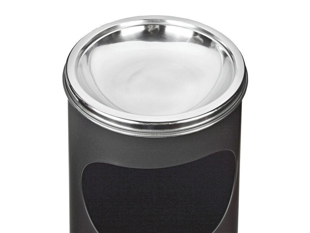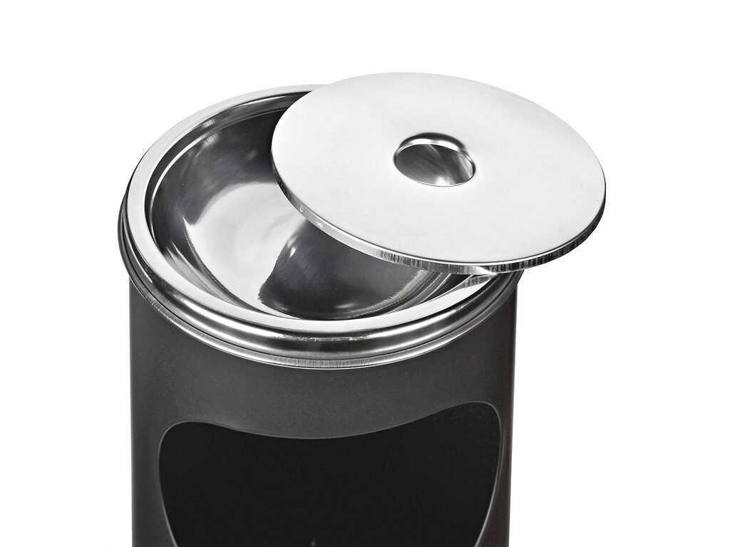 Kovový venkovní popelník - odpadkový koš. Kvalitní kulatý popelník s košem má povrch v černé matné barvě kombinovaný s nerezovou popelníkovou částí. Horní část s popelníkem a krycím víkem je odnímatelná a může být použita samostatně. Venkovní popelník s košem je vhodný pro použití jak uvnitř budov, tak i venku. Popelník je dodávaný v kartonové krabici. Rozměry: výška 58,5cm, průměr 21cm.