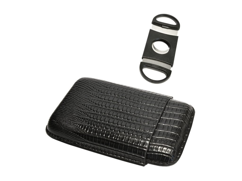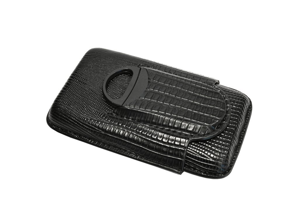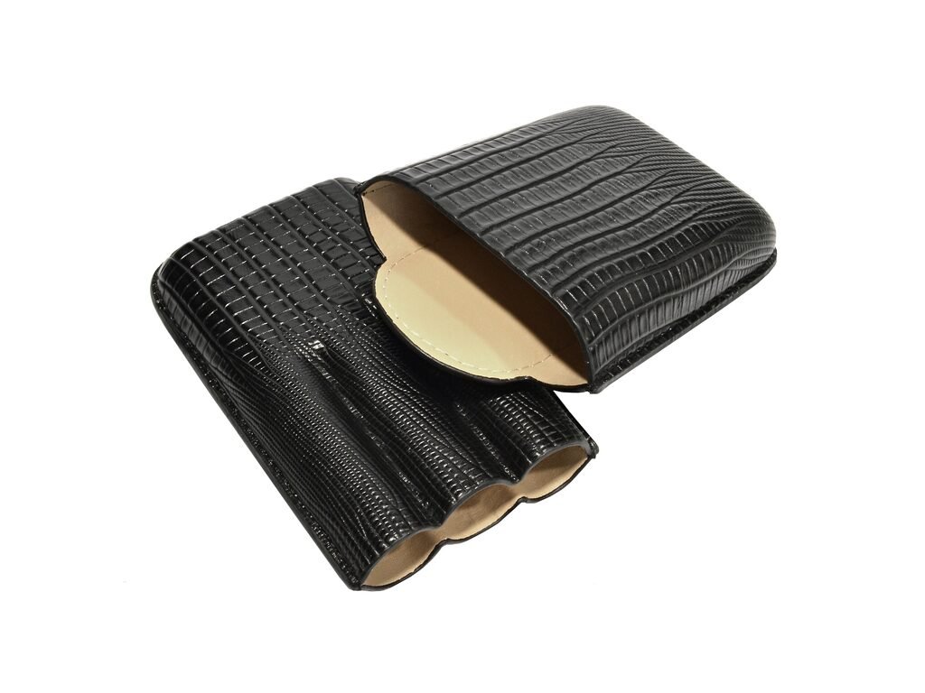 Pouzdro na tři doutníky (Etue) Trigus. Pouzdro na doutníky obsahuje doutníkový ořezávač. Doutníkové pouzdro je dlouhé 14,5 cm, průměr 2 cm. Pouzdro na doutníky je z PU.