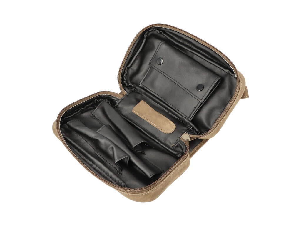 Etue - kožené pouzdro na 3 dýmky se zipem a praktickým poutkem. Prostorné pouzdro na dýmky Leather vyrobené z kvalitní broušené kůže je ve tmavším hnědém odstínu. Po odklopení horní strany zavřené na magnet najdeme na přední a zadní straně kapsu např. na tabák a další potřebné dýmkové příslušenství. Po rozepnutí zipu se objeví hlavní prostor pro tři dýmky s odepínací kapsou s patenty. Pouzdro nejen ochrání vaši oblíbenou dýmku, ale současně poskytne prostor pro vše potřebné pro kouření dýmky.