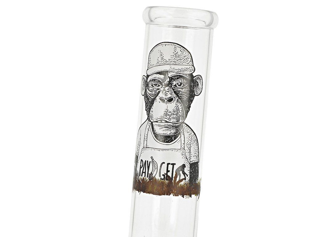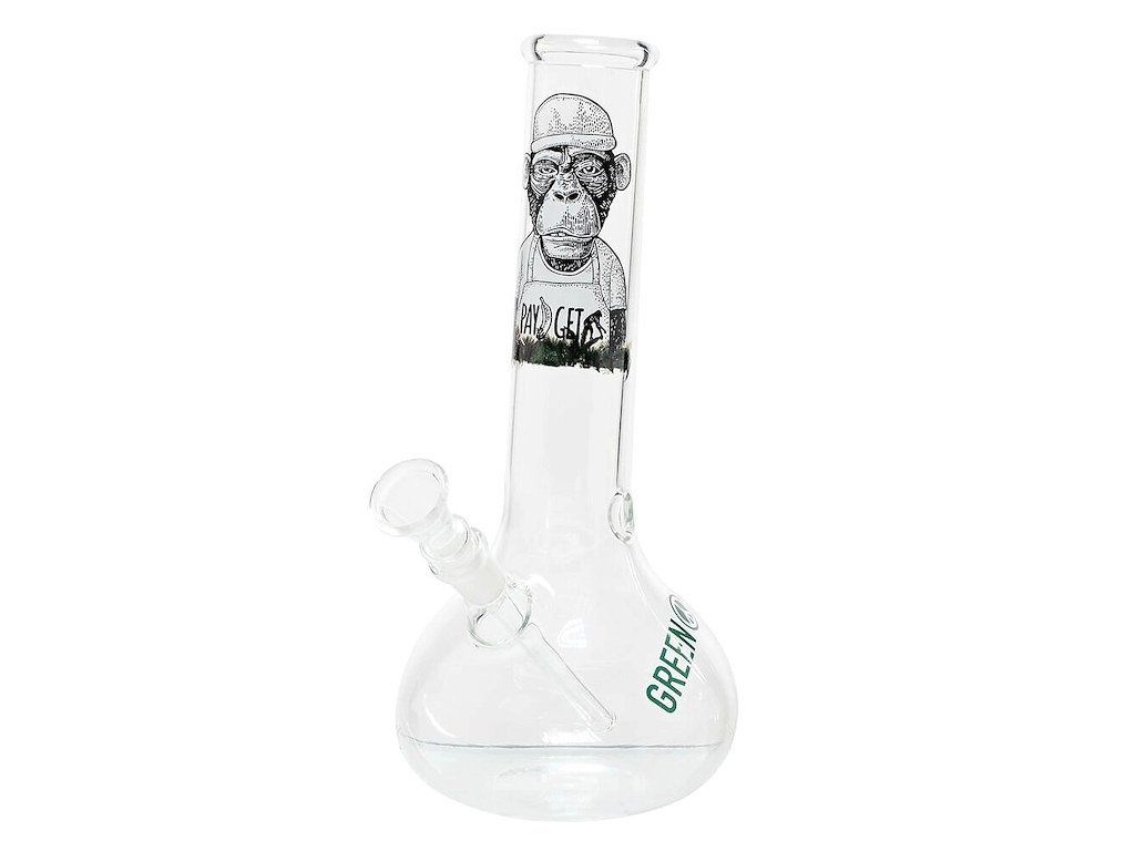 Zalomený skleněný bong Greenline. Transparentní bong je zdobený potiskem s opicí a logem Green. Bong ukončený slabším hrdlem má ve spodní části otvor pro turbo. Oproti standardním bongům je tento prémiový bong vyrobený z tepelně odolného borosilikátového skla tloušťky 2,5 mm. Jednodílný chillum bongu je ukončený nalisovaným kotlíkem s větším otvorem cca 8 mm.